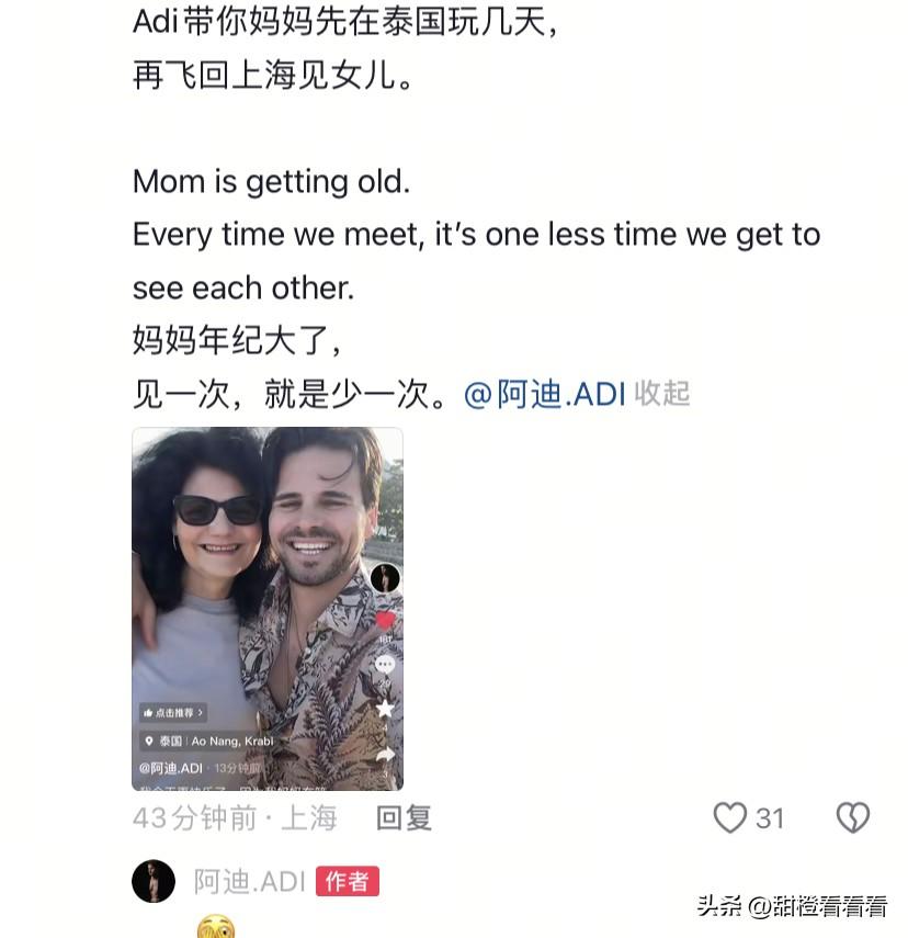 可能真被网友猜中了,阿迪妈妈这次来泰国,有可能会去上海见凯莉,看看阿迪的发文是不是有点这方面意思呢? 他说,他妈妈在罗马尼亚的时候告诉他,阿迪,我真担心我这辈子再也见不到凯莉了!这句话什么意思呢?说妈妈想凯莉,要见凯莉,去上海,妈妈去了盈公主会不会见面接待呢? 评论区有人建议他带妈妈旅游后去上海,他也回复了网友,没有说去也没有否认。不得不说阿迪现在是越来越会吊人胃口了,每次都会说一些让人半懂半不懂的话。