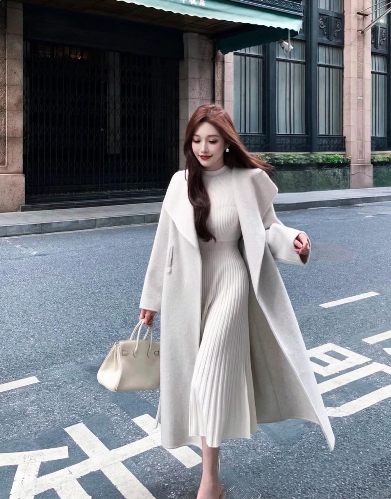 这套是酷飒优雅都市风,核心是灰黑叠穿+长外套:长款大衣自带松弛气场,内搭全黑套装