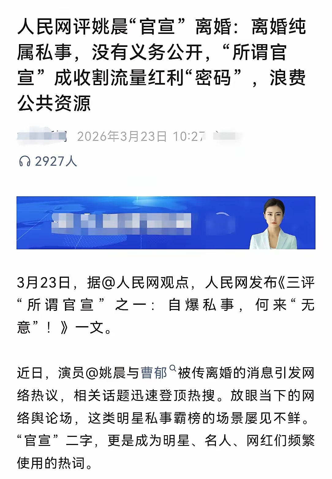 太罕见!姚晨遭人民网发文痛批!据媒体报道,人民网发文对姚晨“官宣”离婚提出批评