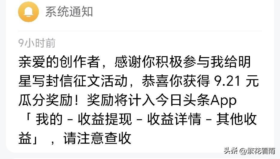 给明星的一封信发奖金了,收到9.21元,这个活动要求单篇500阅读量,当初写完后只有100多阅读量,就一直置顶放着,每天有空时就去互动一会儿,大概置顶了一周多时间才完成500阅读量,全靠互动友友支持,也是不容易啊。 带定位晒今日生活 我的今日状态:😁轻松愉快 我这里的天气:☁️阴天