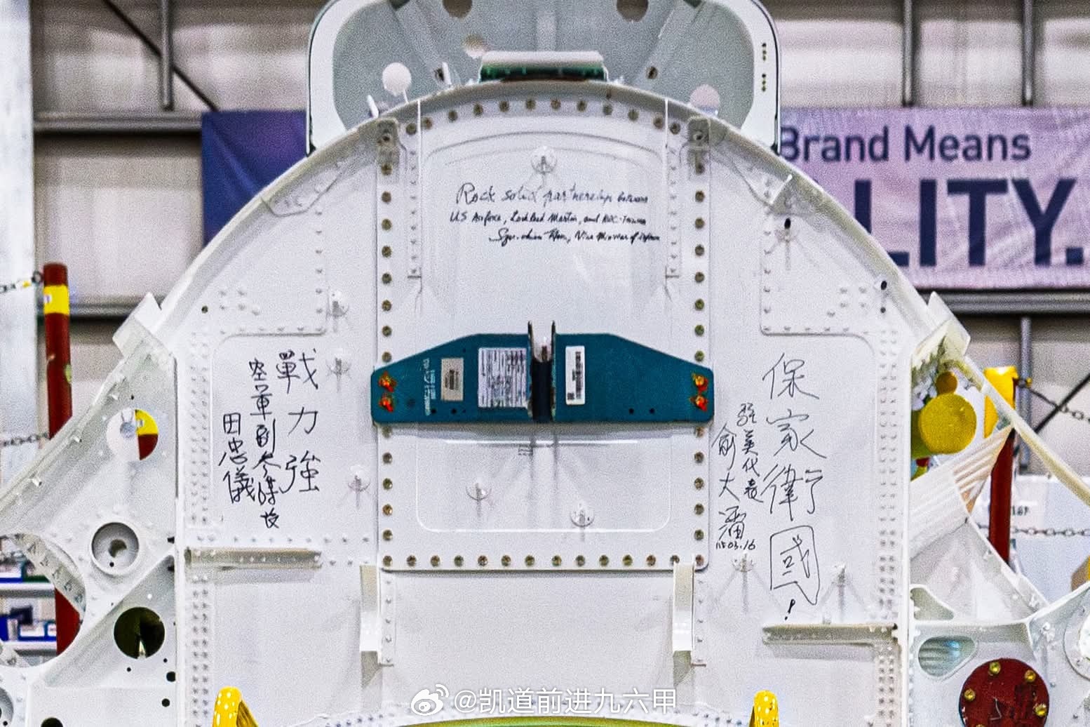 台海局势 台伪代表团于上周赴美国南卡罗莱纳州视察首架完成验收飞行测试的F-16V BLK70,并在生产线上一架半成品F-16V的前/中机身隔框上写下到此一游。