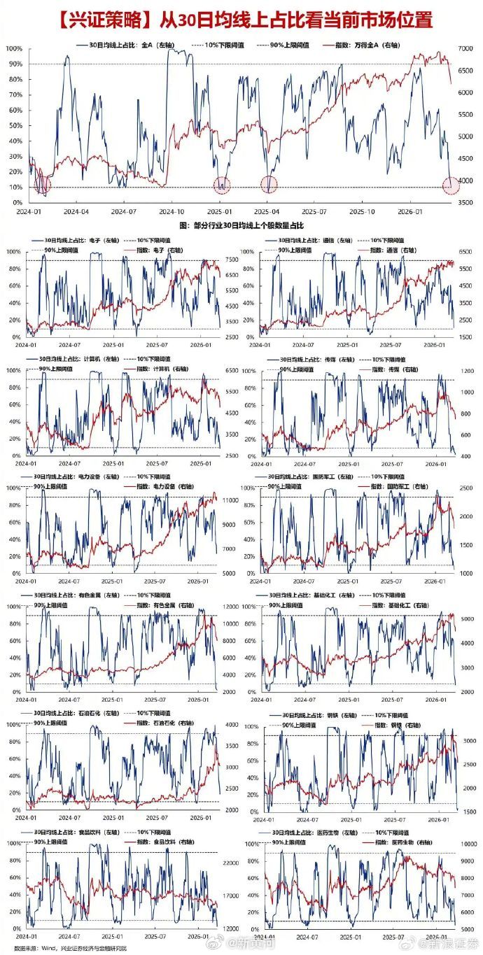 【兴证策略:#A股出现关键信号#】截至3月23日,全市场30日均线上个股占比已降至9.9%,多个行业该指标同样回落至10%以下的位置。#A股# 最近几年看,每当这一指标降至10%以下,均是阶段性底部的关键信号,成为市场重要买点,如2025年4月、2025年1月、2024年1月。(新浪证券)#A股集体高开#