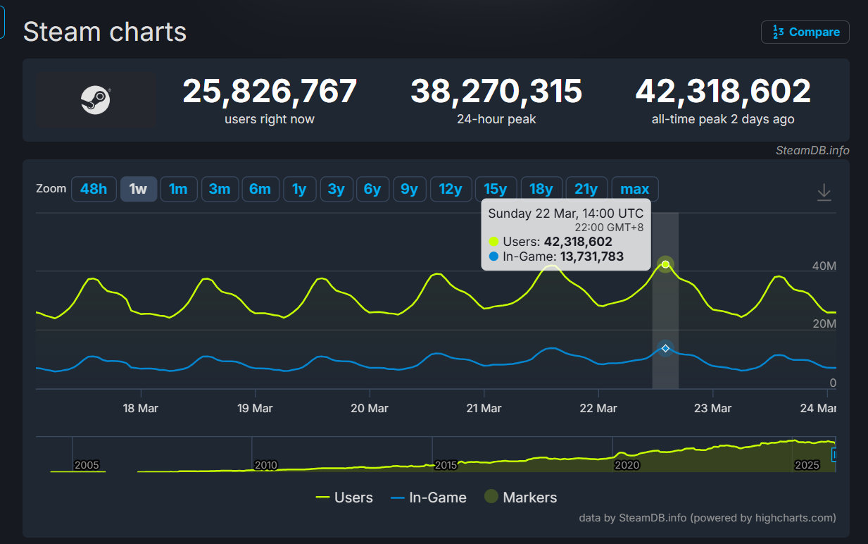SteamDB数据显示,Steam平台的最高同时在线人数于3月22日晚22:00点突破4231.8万,再创历史新高。