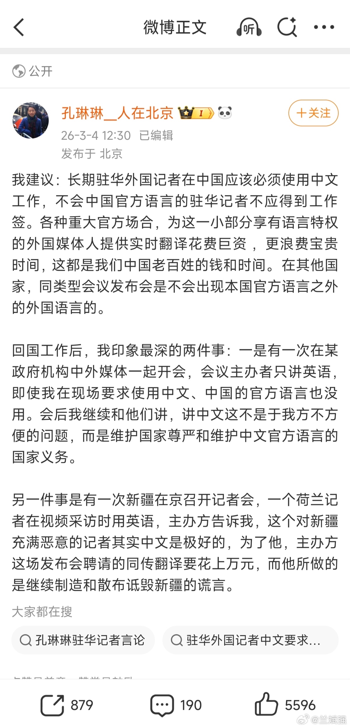 我以为,记者孔琳琳提出的是一个非常好的倡议。首先,作为从事外事工作的记者,学会所在国的语言这是获得工作签证的基本要求,也是一名新闻工作者的基本功。我们经常在新闻里看到,我们在外工作的记者都是直接用外语发问和与他们对话,他们根本不会给我们的记者配备什么翻译。而在我们国家,外国记者不论采访或者出席会议,一般是要给他们配翻译的。一个记者招待会,发言人用中文说一遍,还一定要翻译用外语再说一遍。为什么?因为他们中的一些人确实听不懂中文,为了他们报道方便,还一定要翻译给他们听。
