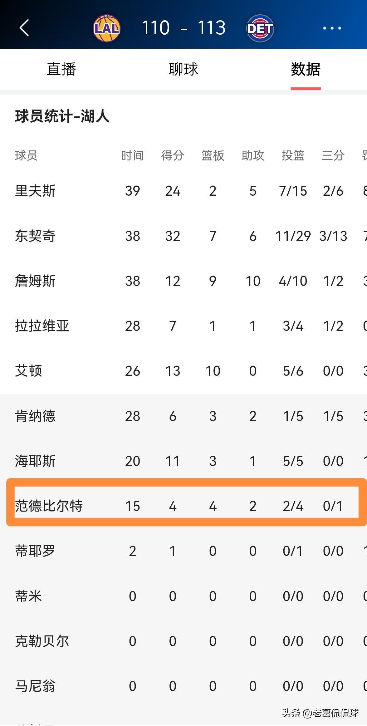 湖人悍将范德比尔特终于又得到重用了!尽管今天湖人在客场以110:113输给了活塞,但是重新得到雷迪克教练重用的范德比尔特却不负众望,他在攻防两端都打出了可圈可点的表现。 整场比赛下来,范德比尔特替补出战15分钟,投篮4中2,其中三分球1中0得到4分4篮板2助攻,没有出现任何的失误,他的场上正负值为-2。 老实讲,虽然范德比尔特的进攻能力不强,但是他在防守端确实有两把刷子,希望雷迪克教练能够在接下来的比赛中继续重用范德比尔特。