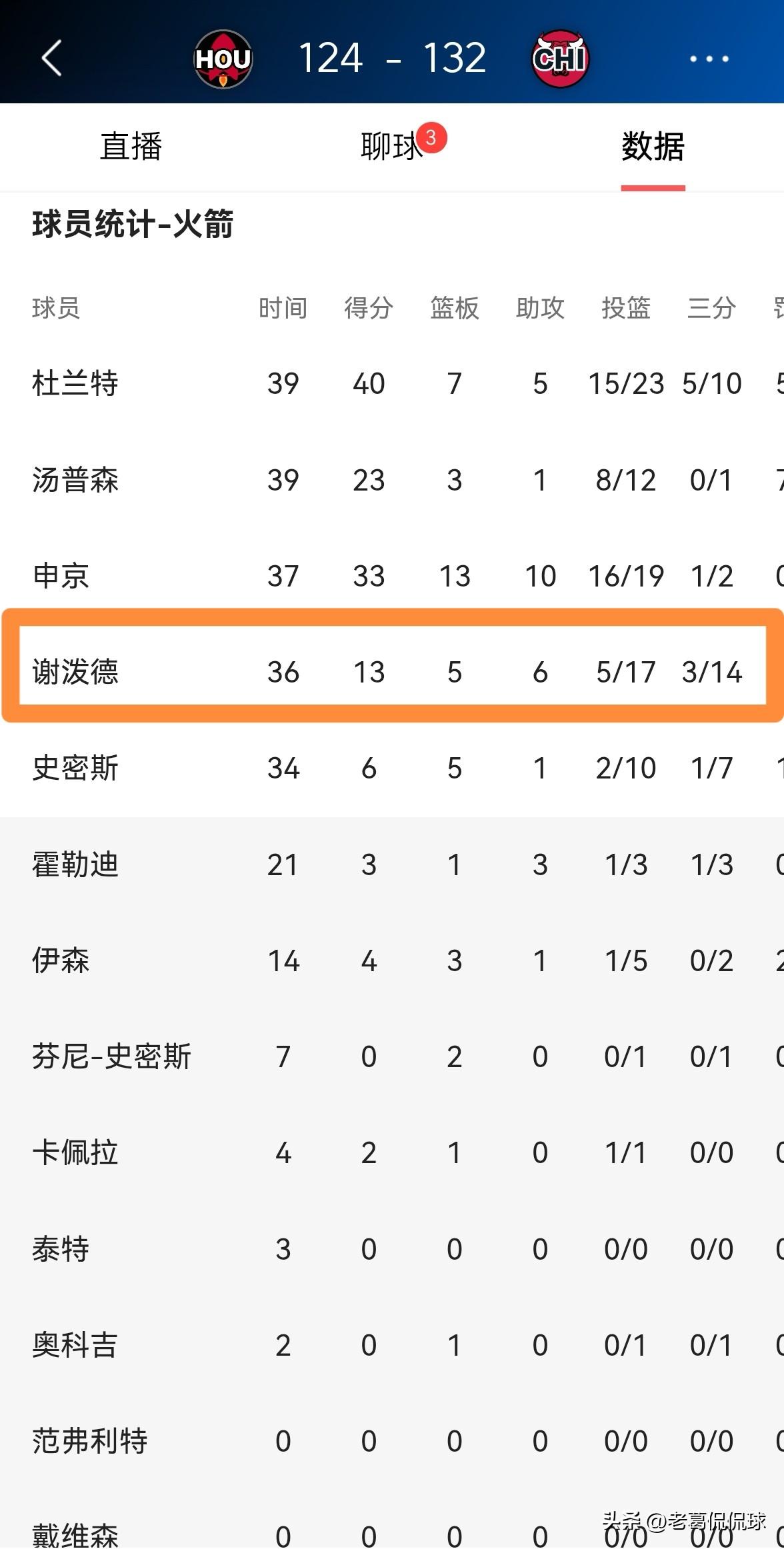 火箭新星谢波德必须为球队的失利背锅了!在今天火箭客场以124:132不敌公牛的比