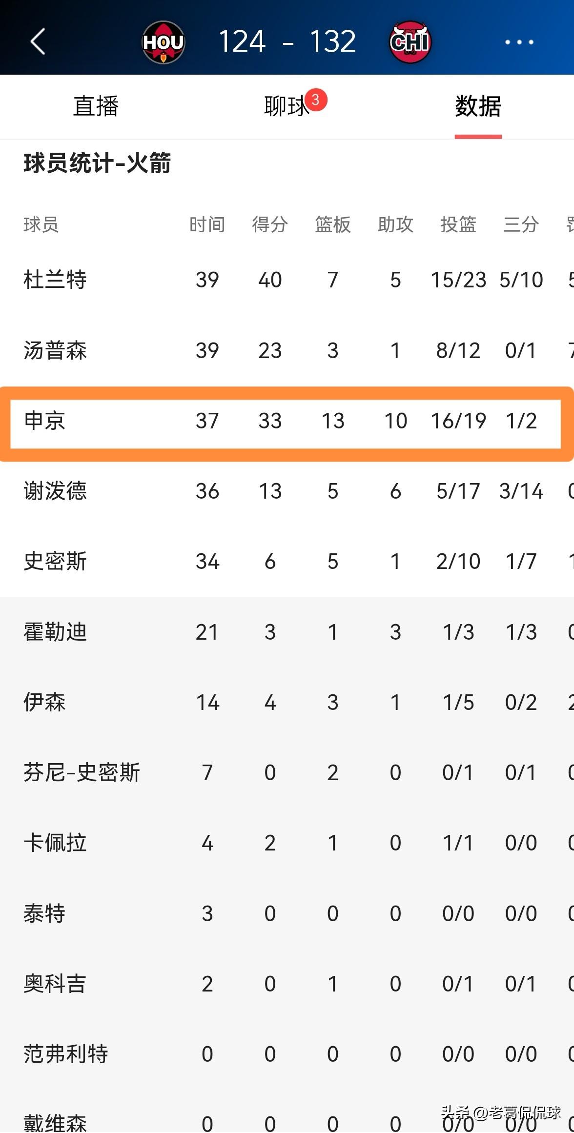 火箭当家中锋申京真是恨死谢波德了!虽然今天火箭在客场以124:132不敌公牛,但是申京却豪取三双,然而由于谢波德的拉胯,申京的精彩表现最终化为了乌有。 全场比赛下来,申京首发出战37分钟,投篮19中16,其中三分球2中1极其高效的砍下33分,还有13篮板10助攻2抢断2盖帽,他的场上正负值为-6。 坦白说,本场比赛申京是火箭阵中表现最好的球员之一,当申京在赛后看到谢波德的数据统计时,申京一定恨死谢波德了。