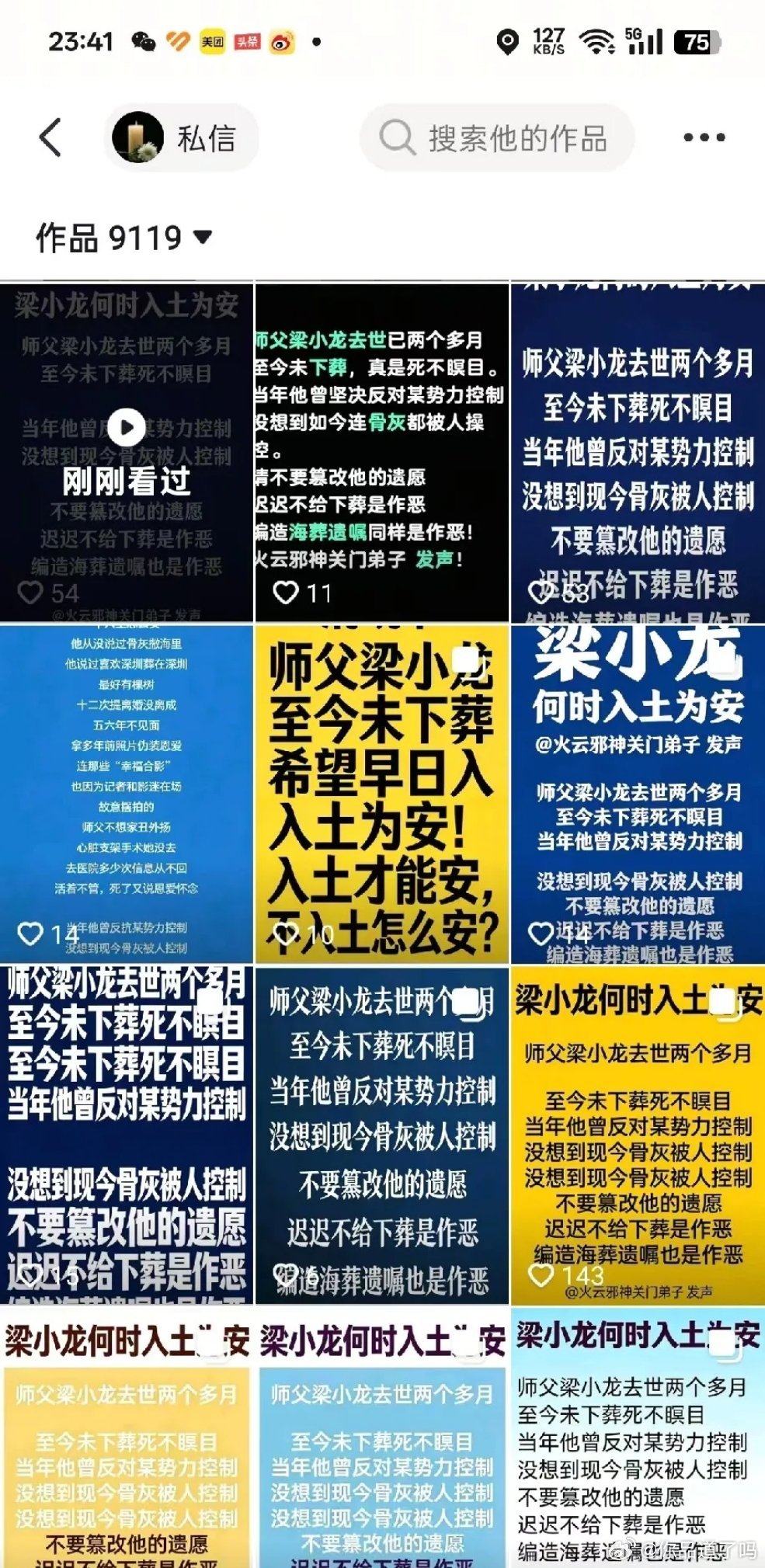 梁小龙的徒弟用师傅的账号,一天连发几十条视频控诉师母,还以梁小龙的口吻发声,指责其妻子心肠歹毒,称梁小龙过世两个月仍未下葬,对方却还营造夫妻恩爱人设、企图抢夺账号。这名徒弟连日持续发布同类内容,账号几乎被他“玩废”,由于内容重复,每条视频的点赞和流量都十分惨淡。网友也并不站在他这边,认为他身为徒弟,在师傅离世后霸占账号不肯交还其妻小,还在网上公开指责师母,实在不妥。梁小龙在圈内人缘颇佳,如果真和妻子感情破裂十几年,一众好友不可能不知情,也不会无人出面发声。况且陈光标在梁小龙葬礼上,还郑重叮嘱过他的徒弟们,一定要善待师母及梁小龙的子女。可这名徒弟为霸占账号,不仅在梁小龙去世后频繁发布其生前视频,在家属要求归还账号时更是直接翻脸反目,怎么看都不像是真心敬重师傅的人。