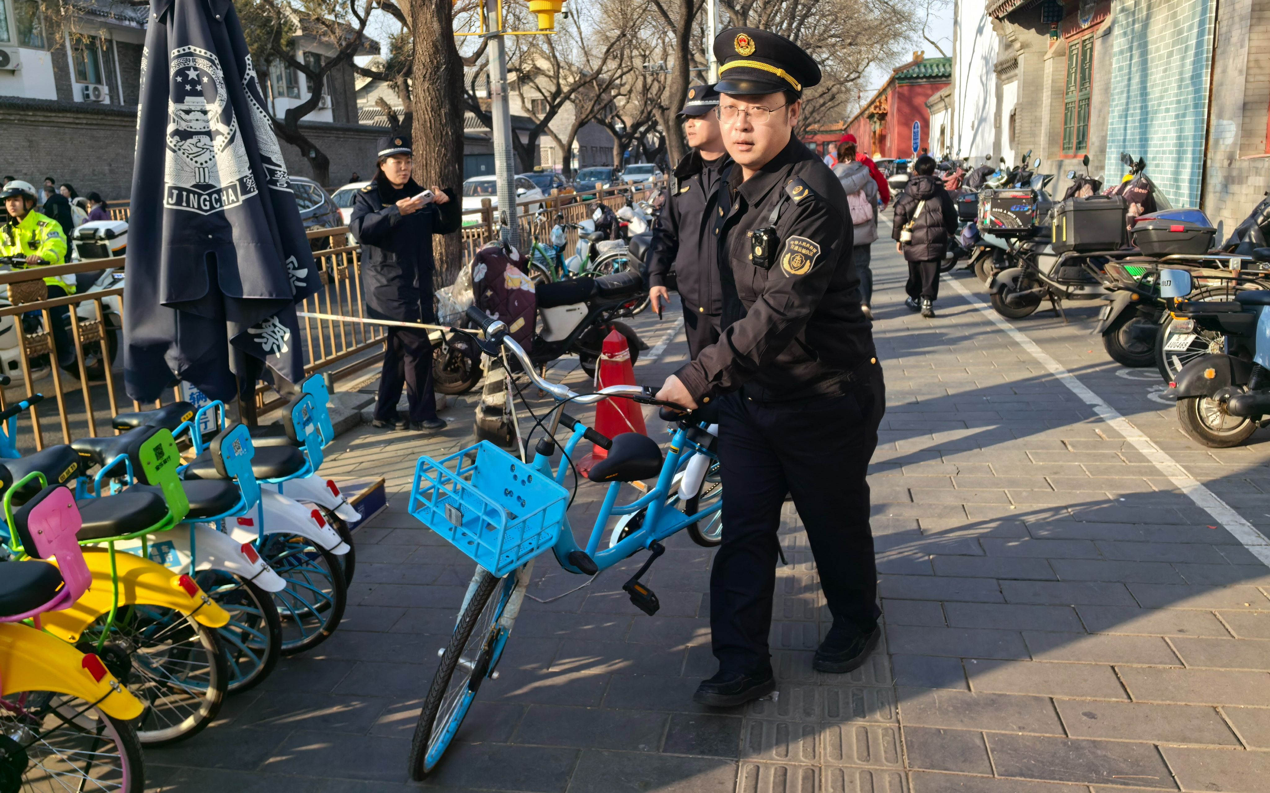 媒体曝光后,总队第一时间联动西城区城管委、什刹海派出所、什刹海景区管理处等单位,对什刹海景区周边、地安门外大街进行整治,当日即清运什刹海周边违规投放车辆23辆。执法中查实违投主体为3家个体工商户,投放区域涵盖西城区北海、什刹海、南锣鼓巷等,总队当即对违投主体依法开具限期责令整改通知书,责令其两日内回收全部车辆,停止运营,逾期将依法从严处置,并同步部署勤务力量对什刹海周边开展常态化严密巡查,严防问题反弹。