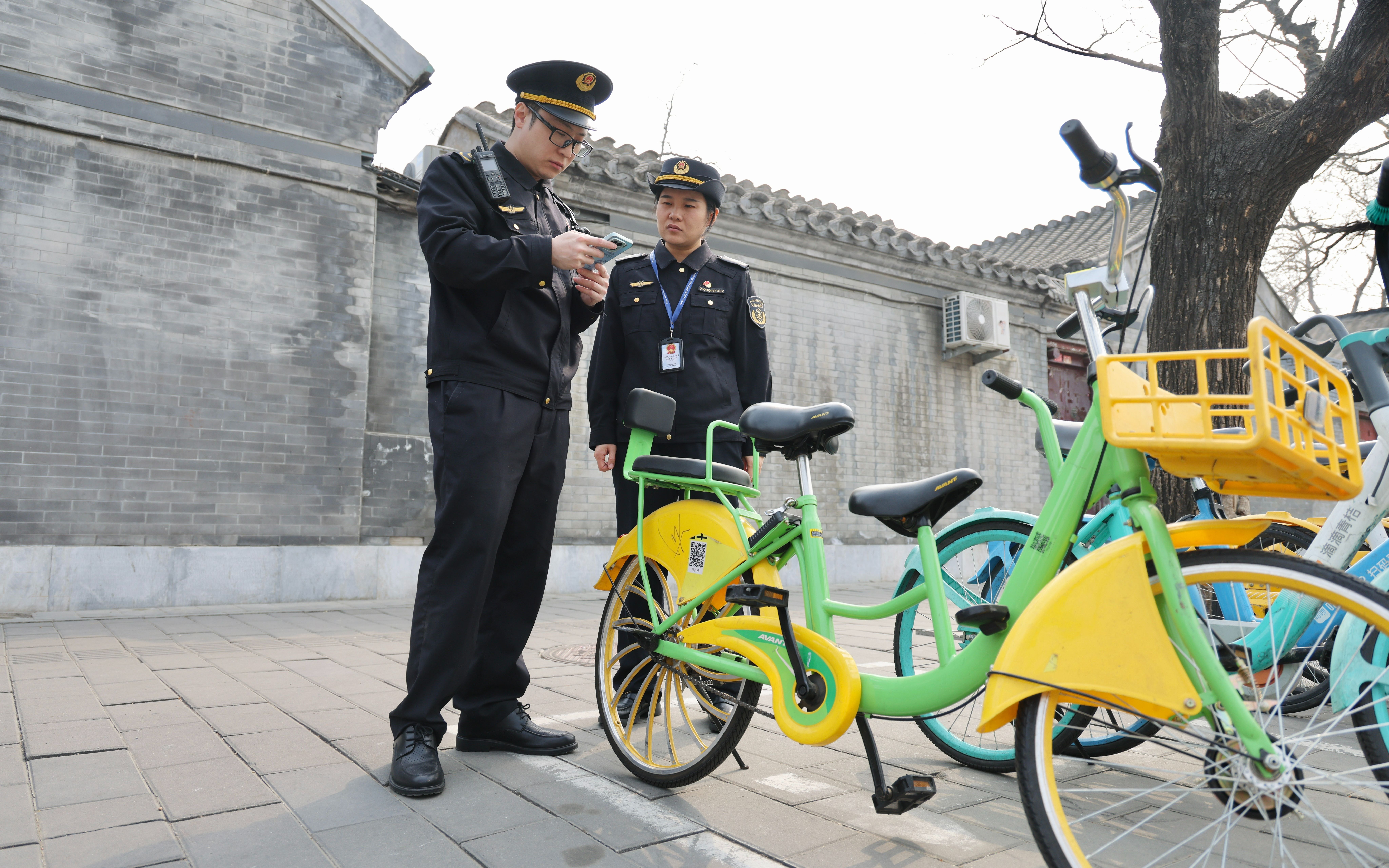 交通执法人员对违规投放的“亲子单车”进行调查取证。北京市交通运输执法总队供图
