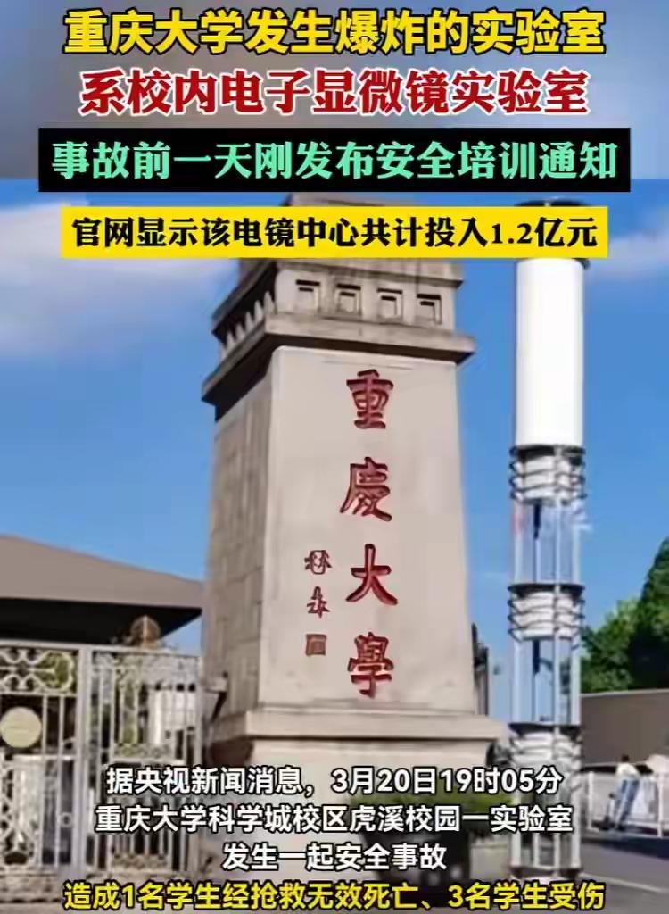 致1死3伤 实验室一声巨响,1死3伤, 四个年轻的孩子,都是重庆大学的学生[流泪] 学校实验室,是学校安全的重中之重,居然出了这么大的安全事故。 一声巨响,1个孩子死亡,另外三个孩子受伤。 四个人都是重大的学生,天之骄子。重大这样的重点大学,孩子能考上,都是优秀的孩子。 二十几岁的青年,风华正茂的年龄。晚上还在实验室做实验,得有多勤奋。 真的是天妒英才啊! 那个死亡的孩子,父母怎么接受自己的孩子死亡的现实? 父母含辛茹苦将孩子抚养长大,又考上名牌大学,孩子未来可期, 可是,一场实验室爆炸,夺走了孩子的生命,也无情地斩断了这个家庭的未来。 孩子走了,这个家庭的希望没了,伤心欲绝的父母怎么活下去? 都是养儿养女的父母,想到这儿,心痛到窒息 愿逝者安息,愿生者节哀,愿伤者早日康复[祈祷][祈祷][祈祷] 高校安全事故