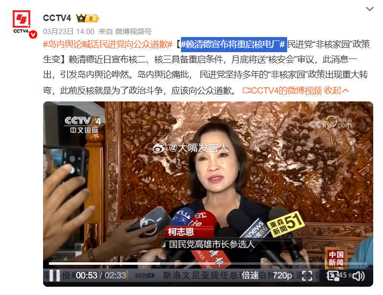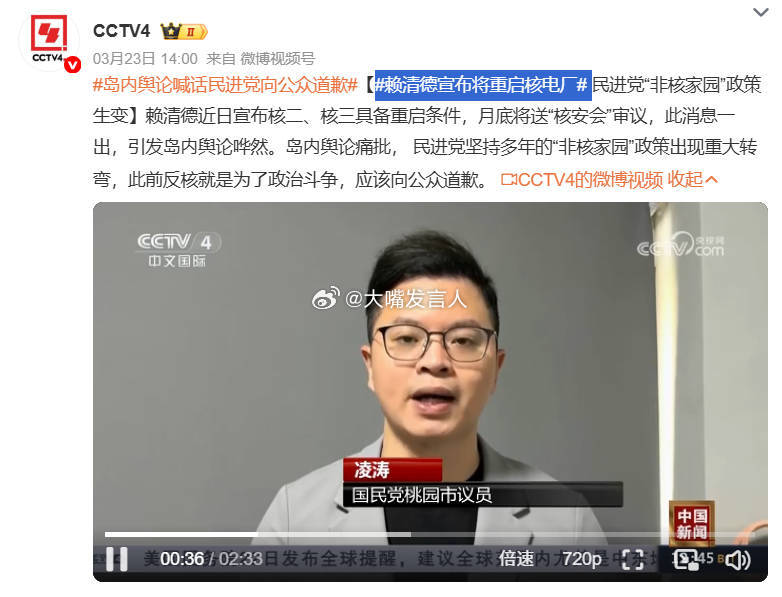 赖清德宣布将重启核电厂 我们的电视画面中,出现凌涛这种蓝皮绿骨(图1)、公开说拒绝统一、公开支持高市早苗湾湾有事就是日本有事言论的画面,有点不合适吧竟然还有柯痔恩这种蓝皮绿蛙的画面(图3)怪不得博主开启评论精选呢(图4)岛内舆论喊话民进党向公众道歉,热点观点