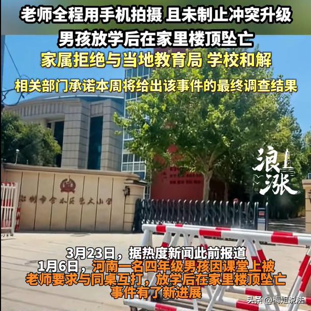 河南,一位四年级小男孩,上课的时候跟旁边的小朋友发生了矛盾,当时二人起了争执。上课的老师没有规劝,而是把两个小朋友拎起来,让他俩站到讲台上,当着全班同学的面互相打对方50次。两个小朋友继续打人、老师则在一旁拍照、底下的同学全程围观。放学后,其中一个小朋友回家,从家里的顶楼掉下来离开人世。 家长说:我们不要赔钱,我们要个说法,我们要求立案。 浪涨新闻3月23日报道了这则新闻。 事情发生于河南的某个学校里。 当时,四年级的孩子们正在上课,有两个男孩子上着上着,突然就在课堂上打起架来。 上课的老师内心非常生气,他准备想个方式来“教训”一下这两个孩子。 老师的处理方式是,让这个两个男孩站起来,然后走到讲台上。 两个孩子也不知道老师想要怎么惩罚自己,都乖乖的站起身,慢慢的往前走。 没想到,走到讲台旁边的时候,老师竟然让两个男孩站到教桌上去。 两个孩子面面相觑,没办法,这是老师的指令,只能爬上了讲台。 爬上去之后,老师说:你俩互相打对方,每个人打彼此50下,现在就打。 听到老师的话之后,孩子非常害怕,毕竟这是在课堂上,底下还有几十双眼睛盯着自己的呢,这样做,自己也受到伤害、对方也会被伤害、同时脸都要丢尽了。 然而,老师并没有要放弃,他就是要用这个方式来惩罚面前的两个男生。 “啪啪~”两个孩子只能照做,开始动手打对方。 两个孩子很快就被对方打的要哭起来。 而老师不仅不阻止,还拿起手机,给两个孩子的行为,拍摄了全程。这种委屈,咱们换位思考,换做是各位,你们愿意去做吗?你们作何感想呢? 惩罚结束,老师让两个男生下去,回到课桌上继续听课。 而其中的一个男孩早就低下头,蒙着脸,内心非常纠结,孩子的内心在想什么,他在心里暗暗下着什么决心,或许,只有他自己清楚了。 傍晚放学了,男孩回到家闷闷不乐,爸爸妈妈还以为孩子跟平时一样,放学回来、吃饭写作业,丝毫不知道,孩子今天在学校里遭遇了什么。 晚饭过后,爸爸妈妈发现孩子不见了。 没过多久,全家在楼底下找到了孩子,但是男孩早就没有了呼吸。 看这样的情形,孩子应该是从家的楼顶坠落下来的。 家长这才发现不对劲,因为男孩回家之后就情绪不对,他们立刻跟学校联系,跟孩子的同学联系,这时才得知,孩子今天在学校遭遇了很痛苦的事情。 没有前因,哪有后果? 男孩的家长悲痛欲绝,带着孩子去讨要道理。家长的意思很坚定:“我们不要钱!我们不要赔偿,请给我们一个合理的说法!” 如今,相关部门已经介入调查,并且保证,后期会给家长一个答复。 本应该在阳光下奔跑嬉闹的年纪,却遭遇了一场无法阻止的羞辱,然后还永远的离开了这个世界,实在是令人揪心。 始作俑者,当事老师,无法逃离责任。 这位涉事老师,其行为已经严重事失职,很可能构成刑事犯罪,学校也难辞其咎。 根据《教育法》规定,从事教育行业者,需要遵守职业道德,履行教育管理职责。如果后期调查结果发现,教师行为确实过分,可以根据《刑法》规定,对老师采取强制措施,因为孩子的离开,跟老师的行为,存在直接的因果关系,可以依法追究刑事责任。 根据《未成年人保护法》规定,在没有征得学生、以及家长的同意下,不可以随意拍摄、传播未成年人遭受侮辱的画面。 让孩子当众互相打对方50下,已经对孩子造成人格侮辱。这位老师已经违反了相关规定,涉嫌侵犯隐私权和人格权。 另外,学校这块也存在管理失职。根据《民典法》规定,学校需要履行教育管理职责,保证学生在校期的安全,有义务制止暴力,保护学生安全。 但是,有不少家长反应,此前这位涉事教师已经有体罚被投诉的情况,校内也有记录,但是学校却没有对这位老师进行处理。 由此可见,校方监管缺失,已经形成了协同性失责。之前被投诉过,如今72天后又继续授课,甚至这次还犯下如此侮辱人的事件。老师跟校方,都需要承担法律责任。 对于此案,你怎么看?