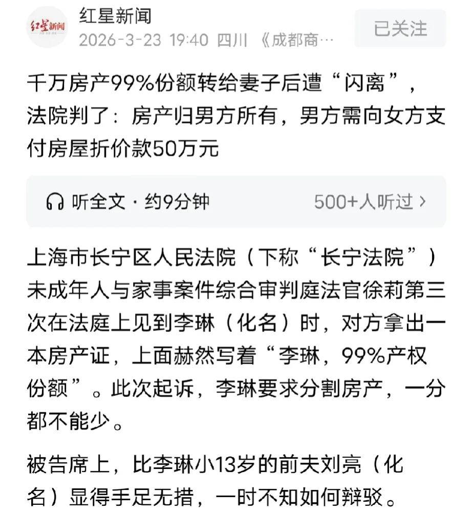 太会算计了!上海,离异女子和小13岁男子结婚,婚后骗男子说,女儿要换到好学校。男子被爱冲昏头,说服父母把家里一套价值千万的房子过户给了他。才过4天,男子又瞒着父母把房子99%的份额转给女子以表忠心。没想到,俩人同居不到半年,女子就提离婚,离婚时半字不提房子,等离完6个月,直接拿着房产证告到法院要又把千万房产吞了。法院最终这么判。 2018年3月份的一天,李琳外出时去搭顺风车,在车上偶遇了同为打车的刘亮。 36岁的李琳温柔漂亮,举止投足落落大方,很快就吸引了刘亮的注意力。 通过聊天,刘亮才知道,李琳是干房产销售的,刘亮告诉李琳自己刚队伍不久,在证券公司做销售。 一路上两人聊得很开心,下车的时候,刘亮主动要了李琳的联系方式。 在之后,刘亮有事没事就找李琳聊天解乏,渐渐熟了之后,李琳告诉刘亮,自己离异带着一个女儿。 听到李琳已经离婚,这让刘亮心中有一点欣喜,刘亮没有谈过女朋友,李琳成熟稳重的外表和儒雅的谈吐让刘亮心生爱慕。 不知不觉,两人走到了一起确定恋爱关系,随着交往的深入,李琳得知,刘亮的父母虽然只是普通的职工,没有高收入,但是他们老房子拆迁后,分得2套房子。 刘亮家的两套房子中,小户型的往外出租,租金补贴家用,大房子刘亮和父母住着,价值1000多万。 李琳得知这些情况后,对刘亮更加上心,交往奔着结婚而去。 2019年1月份,李琳和刘亮背着双方父母领了结婚证,不过,虽然他们领证了,但是还是各自住在父母家,因为李琳说不想和刘亮父母同住。 结婚后不久,李琳提出,她女儿想要换到更好的学校读书,让刘亮帮忙把她们母女的户口转到刘亮家,并提出最好能占有房子份额。 看李琳诚恳善良的样子,刘亮当即同意了,他说他会想办法,很快给李琳一个满意的答复。 刘亮回家后,就跟父母提出,让他们把房产过户给自己,起初刘亮的父母不答应,怕他被骗,但是在刘亮软磨硬泡下,加上刘亮告知他们:将来继承可能要交遗产税。 刘亮父母同意了,2019年7月13日,两位老人把房产份额全部过户到刘亮名下。 办完这一切后,才4天时间,刘亮为了表达自己对李琳的爱,竟然跑到不动产登记中心,把99%的份额过户到李琳名下,自己只留了1%的份额。 李琳得到房产后,为了报答刘亮对自己的爱,两人到外面租房同居生活。 本以为从此两人甜甜蜜蜜,幸福到老,万万没想到,才同居6个月就分道扬镳了。 不久后,李琳起诉到法院要求离婚,不过她没有提到关于房产的事,刘亮舍不得这段感情,没有同意离婚,法院经过审理后认为,两人达不到离婚的地步,没有支持李琳的请求。 可李琳没有放弃,一年后,再次起诉到法院要求离婚,流量看李琳去意已决,心灰意冷之下,同意了离婚,法院判决双方离婚。 万万没想到,离婚半年后,李琳竟然拿着99%的房产份额,把刘亮起诉到法院,要求按持有份额分割房子。 刘亮傻眼了,他没想到李琳这么会算计,刘亮的父母更是捶胸顿足,可又无能为力。 法院审理后认为,虽然房产证上写着女方占99%,但不能只看登记,得看实际情况。房子是男方父母一辈子的拆迁房,女方一分钱没出;两人结婚没多久,实际同居才半年,明显是冲着财产来的。 而且这种婚内赠与本来就是奔着好好过日子去的,不是白送。加上双方没有正式书面约定,女方全程只谈钱不谈感情,法院根本不认可她要99%份额的说法。 最终判决:房子还是归男方所有,男方只需要补偿女方50万元,女方要配合把产权改回去。   《民法典》第1065条规定,男女双方可以约定婚姻关系存续期间所得的财产以及婚前财产归各自所有、共同所有或者部分各自所有、部分共同所有,约定应当采用书面形式,没有约定或者约定不明确的,适用法定夫妻财产规定。 结合本案,男方将父母拆迁所得房产99%份额转给女方,既没有书面财产约定,也未充分协商,不能认定为合法有效的夫妻财产约定,该赠与是以婚姻长久存续为目的,并非无偿赠与。 而且双方同居仅半年、女方对房屋无任何出资贡献,利益明显失衡,法院据此不支持女方按99%份额分房,最终判决房屋归男方,男方补偿女方50万元。 真是机关算尽太聪明,以为靠几句甜言蜜语就能骗走千万家产,从头到尾只认钱不认人,半点感情都没有。最终算盘落空,只拿到一点补偿,真是大快人心,这种只想捞钱的算计注定不会得逞。 对于这件事,大家怎么看?