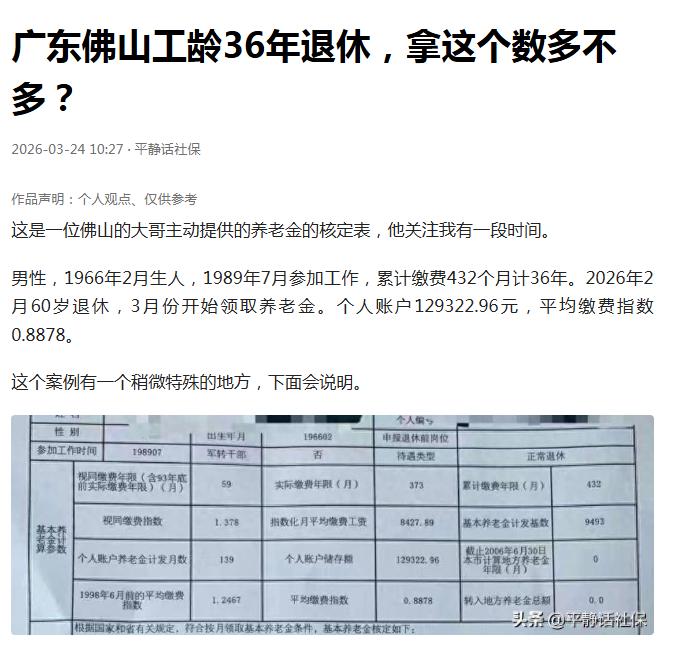 广东养老金 退休地佛山,累计缴费36年,2026年2月60岁退休,指数0.8878,个人账户本息12.93万。最终核定养老金5534.31元。 这个表猛一看是没什么特殊的,但视同缴费年限是59个月。 从表上可以看到,这个格里是视同缴费年限(含93年底前实际缴费年限),1989年7月到1993年12月,我算的并不是59个月。 你们算的是多少? 具体解析,见今天文章。 36年工龄,在佛山,是什么档次?