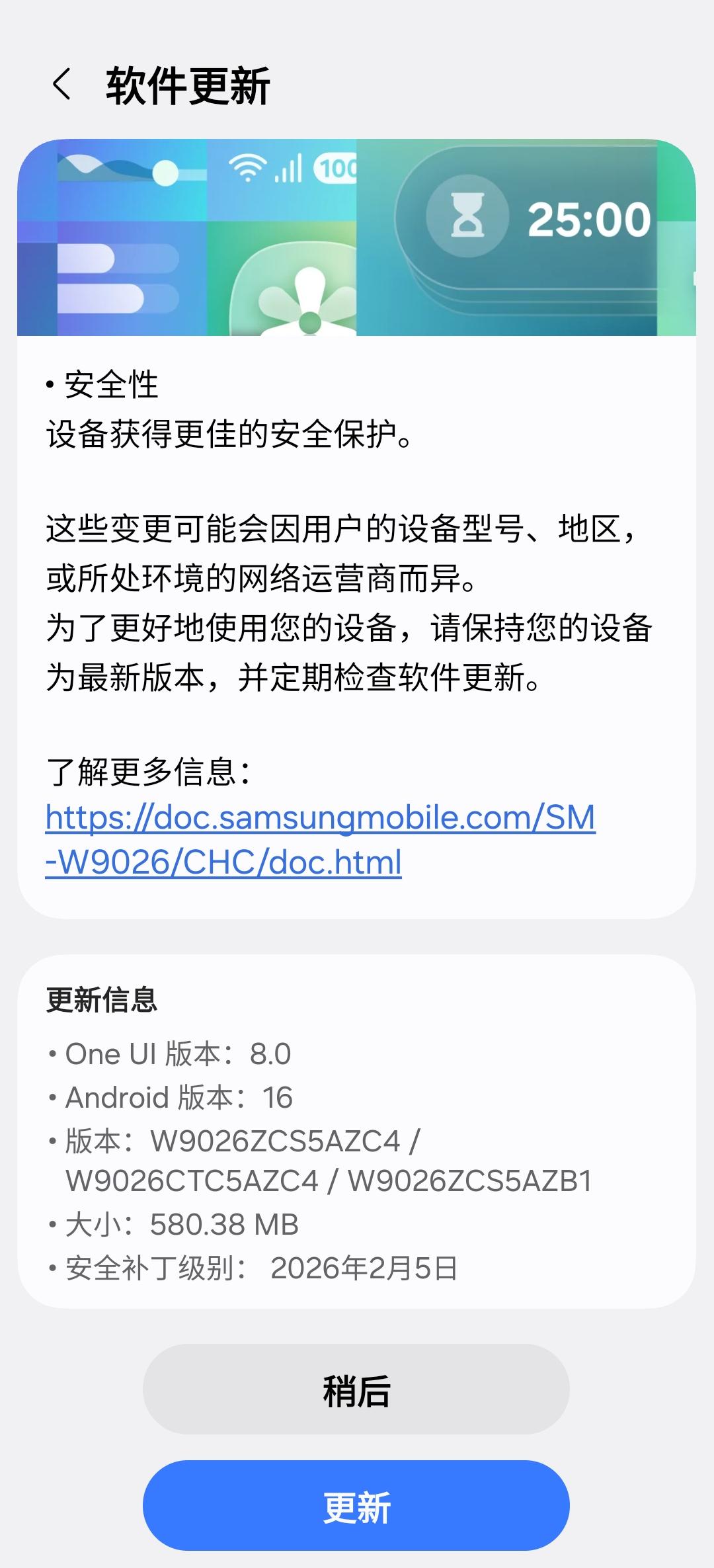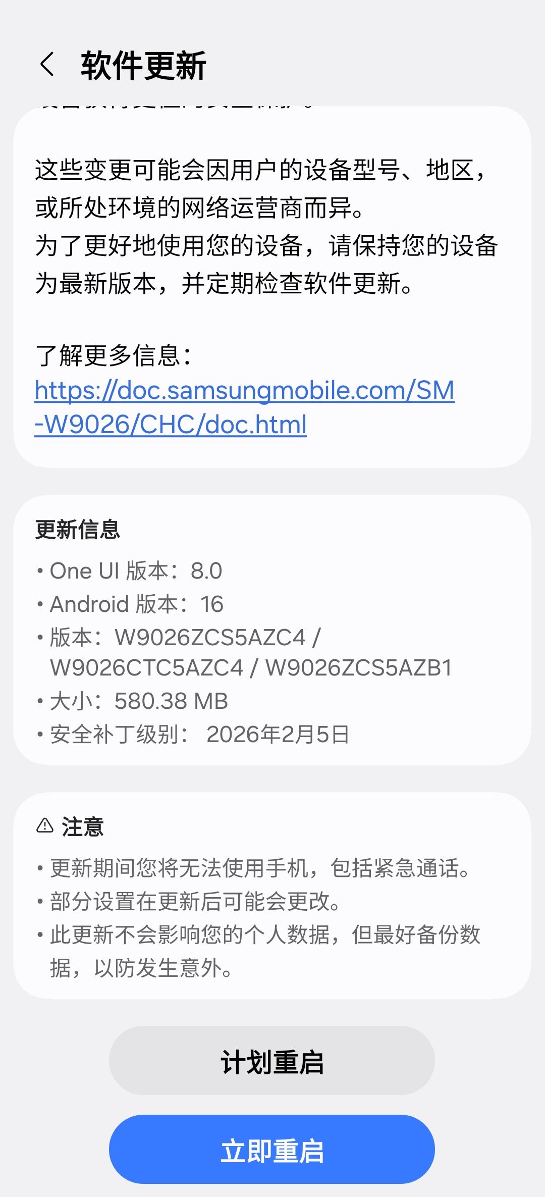 昨天发现三星w26提示系统更新,还以为是更新8.5版本呢,仔细一看原来是二月份设备安全更新。