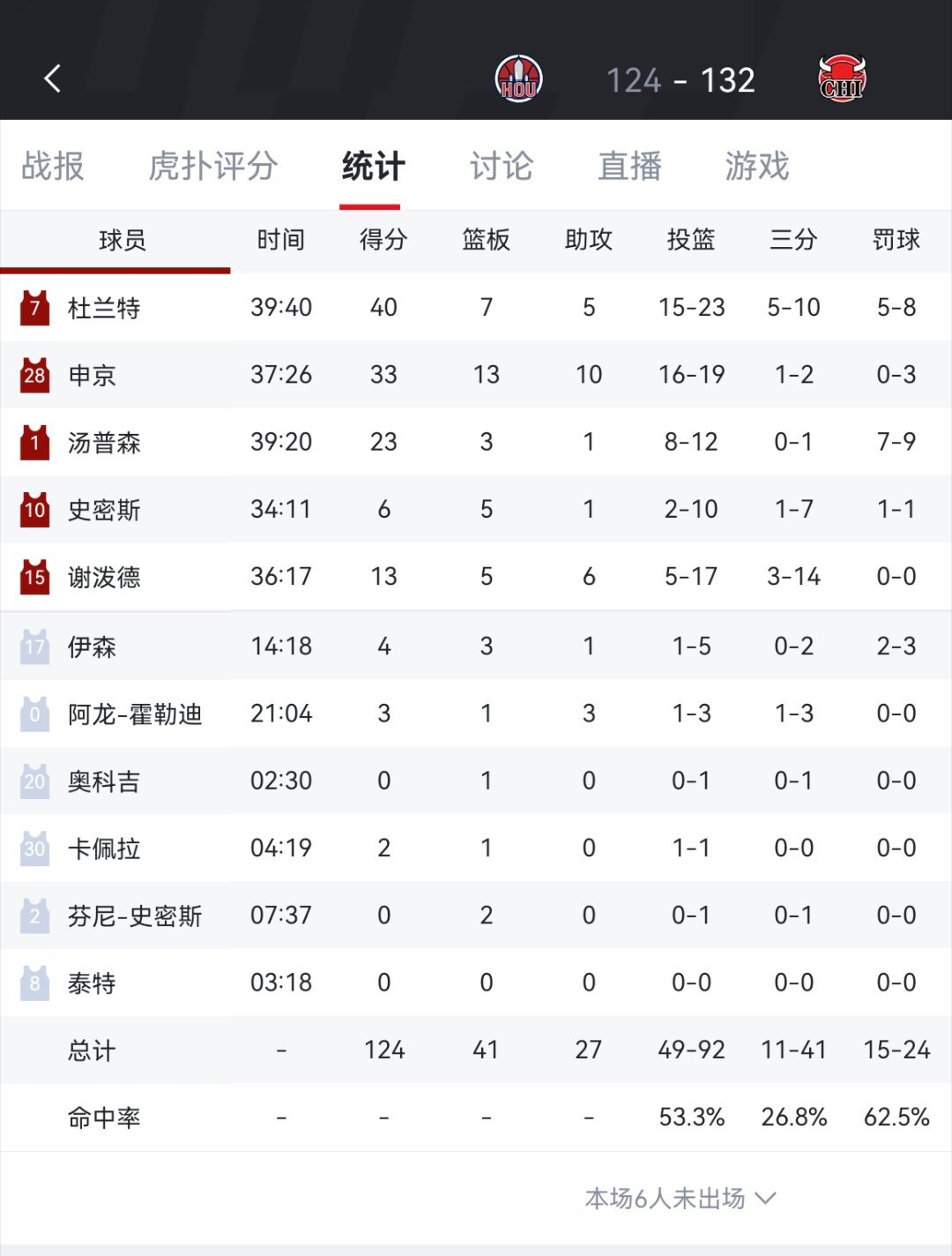 湖人侠!火箭客场124-132不敌公牛杜兰特空砍40分,公牛全队投进19记三分,