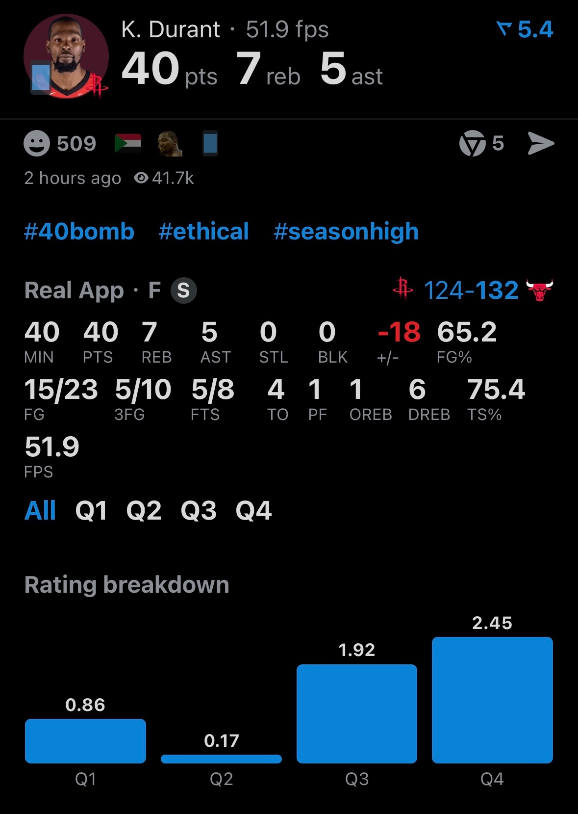 公牛拒绝火箭逆转,主场132-124击败对手。 乌度卡被驱逐,杜兰特40分钟空砍40分。火箭vs公牛