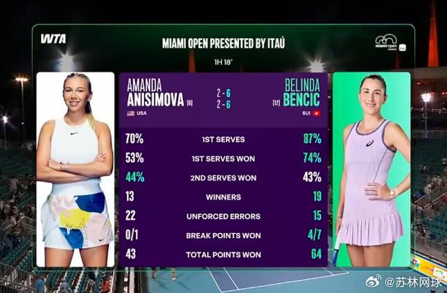 本西奇6-2,6-2阿尼西莫娃拿到迈阿密最后一个女的八强席位1/4决赛对阵高芙本西奇对高芙2-4落后,高芙目前2连胜上次本西奇击败高芙是去年的印第安维尔斯谁能晋级半决赛?wta迈阿密赛女单八强阵容本西奇2比0阿尼西莫娃