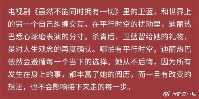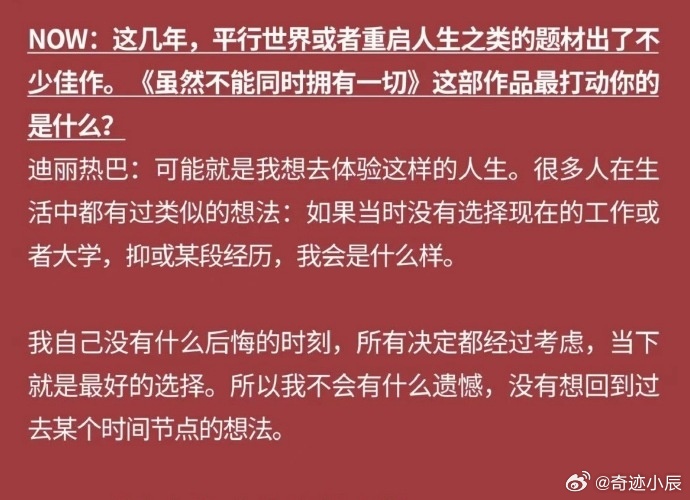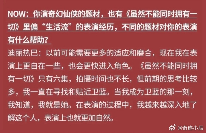 迪丽热巴迪丽热巴对表演始终保有敬畏和热爱迪丽热巴首谈卫蓝 从角色中汲取力量,在表