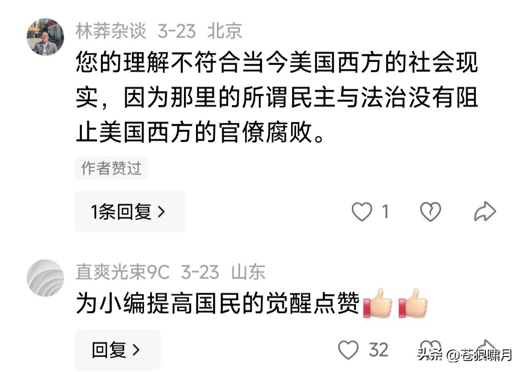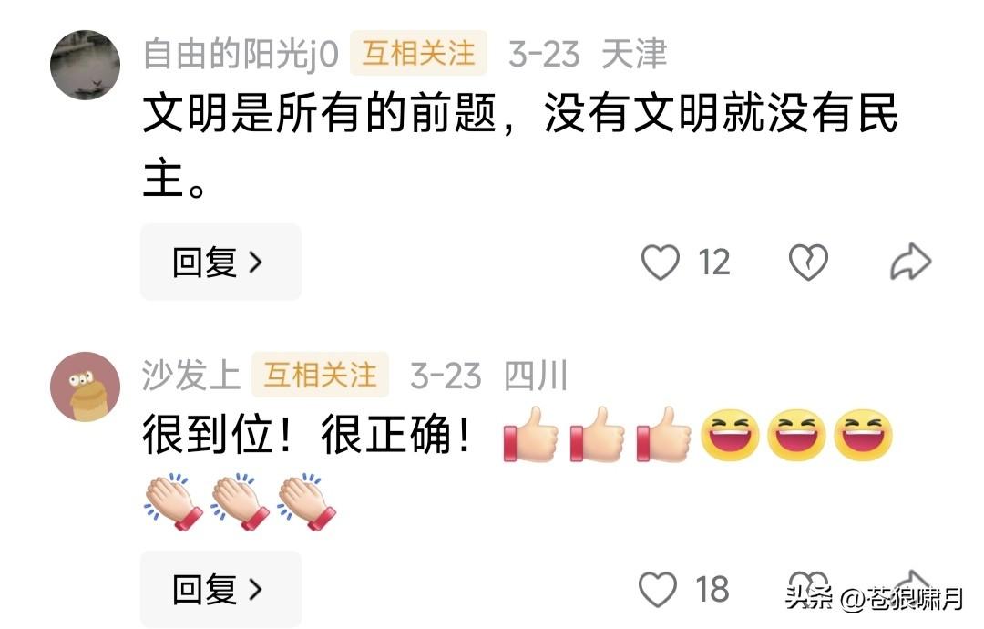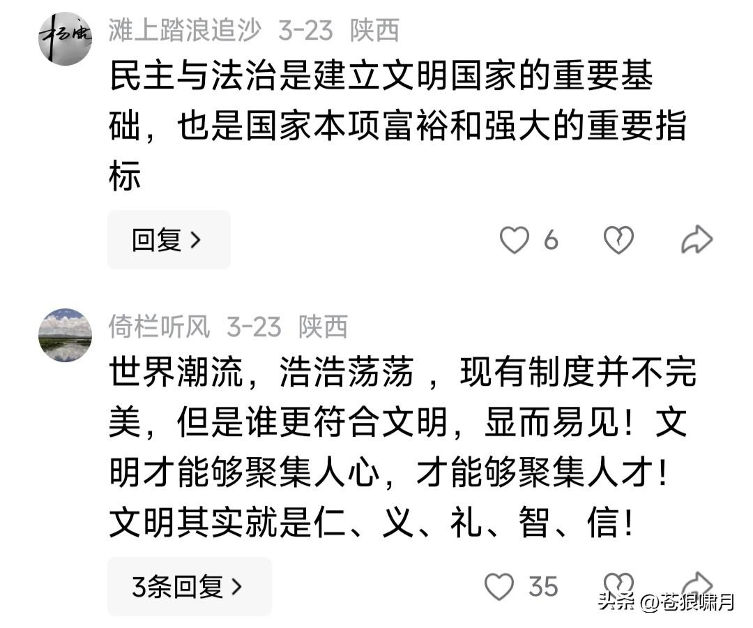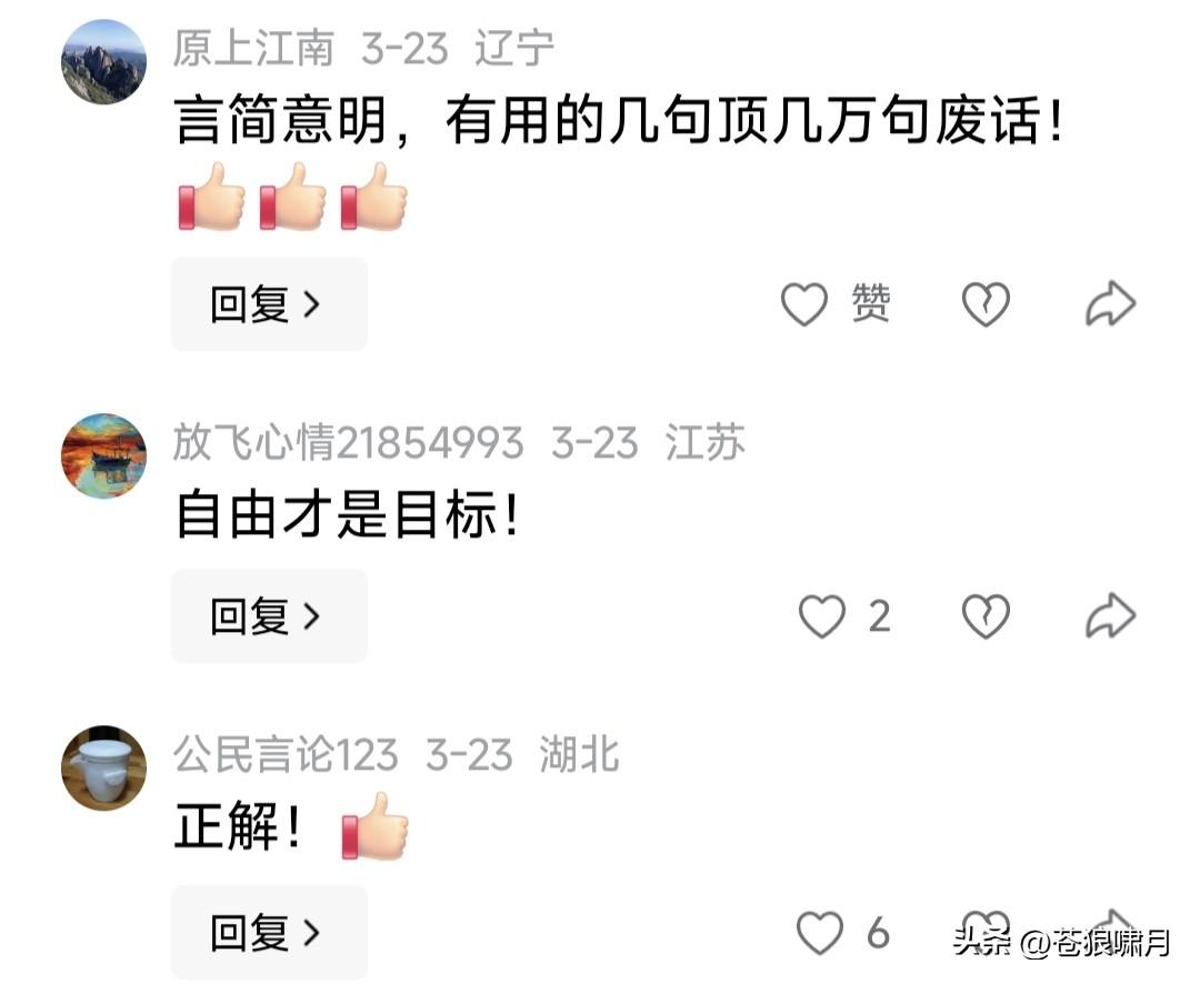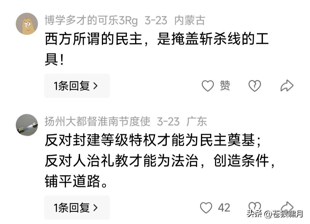 网友谈民主法治:民主解决权力来源问题,法治解决权力运用问题。民主是法治的前提,法治是民主的目标! 这段话虽然不准确,但有一定道理。言简意赅,寥寥数语说出了“民主法治与权力”的相互关系,值得肯定啊! 苍狼为这位网友点赞!更为评论区大多数网友点赞,他们对民主法治的认知与渴望,说明中国未来前程似锦!