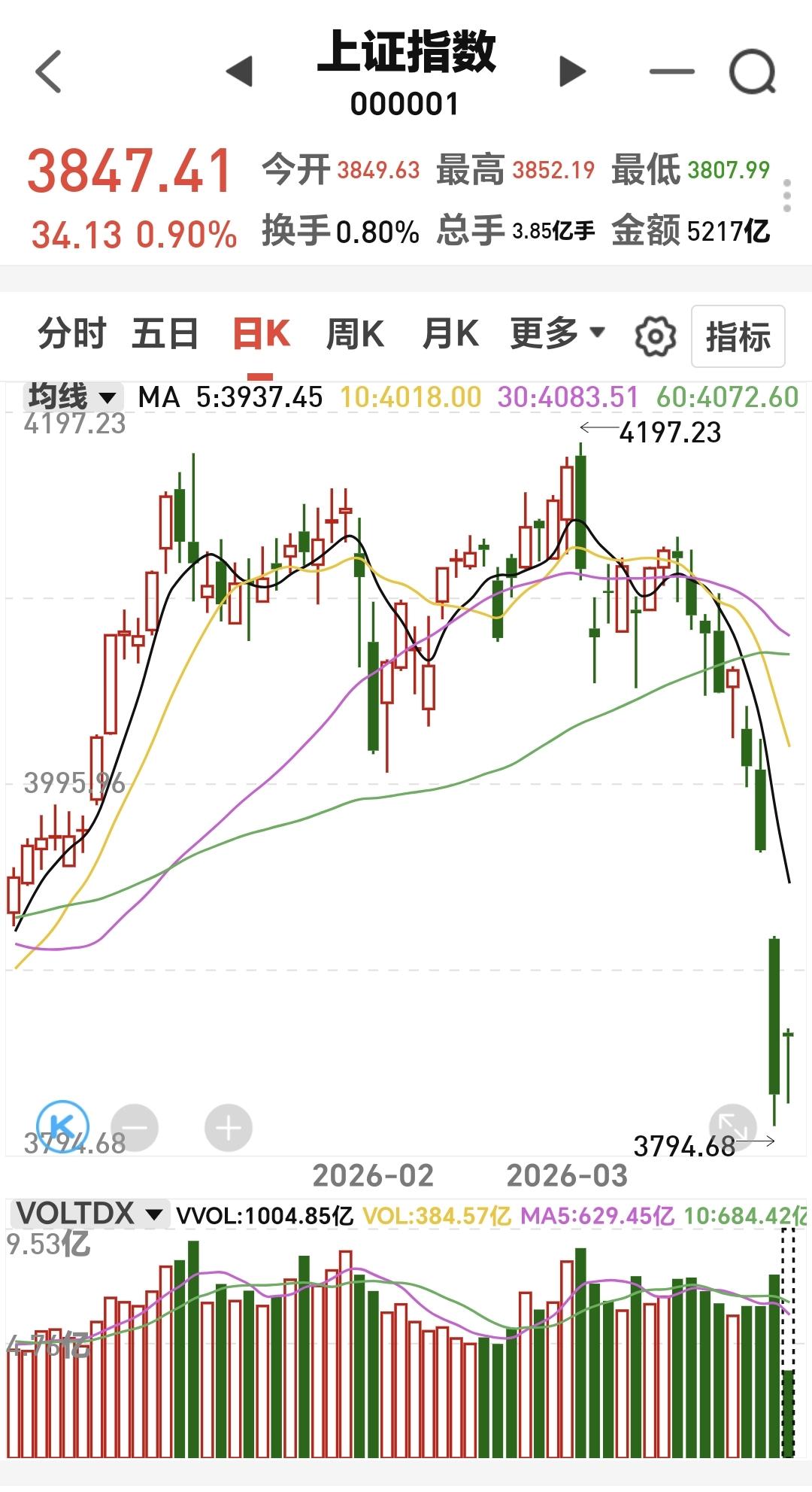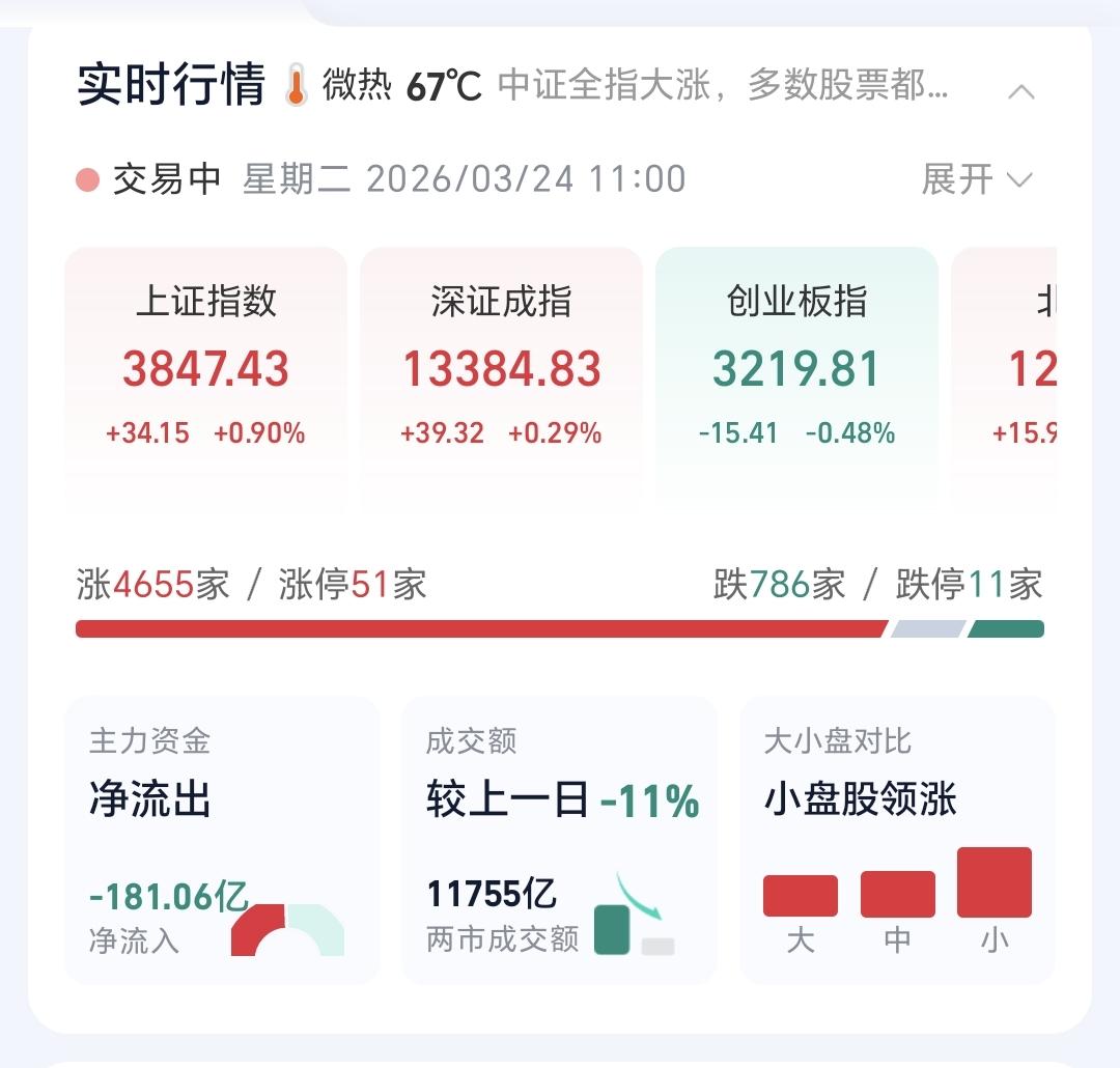 基金:市场反弹当中,调整有没有结束 市场指数涨跌不一,创业板指小跌,上证指数和深成指小涨,创业板指下跌了0.48%,盘中点位3219点,上证指数上涨了0.88%,盘中点位3846点。 现在黄色线在蓝色线上方,两条线之间的敞口比较大,这么大的敞口表明,今天大幅度跳水的可能性不大,即使盘中有跳水,也会拉上来。 两市累计成交11755亿,相比于昨天同期缩量了11%,市场上涨4655家,下跌786家,上涨家数超过了下跌家数,涨停51家,跌停11家,主力资金净流出181亿。 1:到现在为止的反弹还是弱反弹,到现在为止的上涨还没有能够回补昨天的缺口,昨天向下跳空缺口的下沿是3906点,盘中最高3852点,如果今天收盘之前都不能回补这个缺口,或者是部分回补这个缺口,这个反弹都是弱反弹范围。 2:今天上证指数上涨,创业板指到现在为止还是下跌,这是创业板指在补跌,在一轮下跌的过程中,指数的下跌有快有慢,这一次就是上证指数下跌速度比较快,创业板指下跌速度比较慢,真正的调整结束,是需要等待创业板指补跌结束。 3:俗话说,顶部3日,底部3月,这也就是我以前说的逃顶要快,抄底要慢,底部是不可能一天形成的,V型反转的底部是有,但出现的概率是很小的,底部区域通常会震荡一段时间,在底部区域震荡的这段时间里面,哪一天进场都是对的,所以大家不要慌,不要担心会踏空,后面机会有的是。 整个市场上涨幅度最大的三个板块是:黄金板块,电力板块,钢铁板块,下跌幅度最大的三个板块是:储能板块,存储芯片板块,光伏板块。 机器人板块现在盘中估值下跌了0.50%,是连续第四个交易日下跌,持有人数在所有板块当中排名第五位。 机器人板块日线级别跌破上涨通道下轨线以后,形成了新的下跌通道,上周五又下跌跌破了这个下跌通道的下轨线,进入了加速下跌走势,想进场的人需要耐心等待,耐心等待日线级别趋势的反转。 机器人板块上周跌破了周线级别上涨通道的下轨线,本周是继续下跌,这个板块周线级别上涨趋势已经被破坏,长线持有的人也是需要注意风险。 市场只要是弱反弹,反弹结束以后就会继续下跌,反弹的时间不一定只是今天一天,明天还有可能继续反弹,但只要整体反弹的力度在弱反弹范围之内,整个的调整下跌的过程就都还没有结束,这就要求我们需要有足够的耐心,我会密切注意盘面的变化,根据盘面真实的走势来做出判断,有观点以后会第一时间分享给大家。 不管怎么样,大家都要做好随时随地进场的准备。