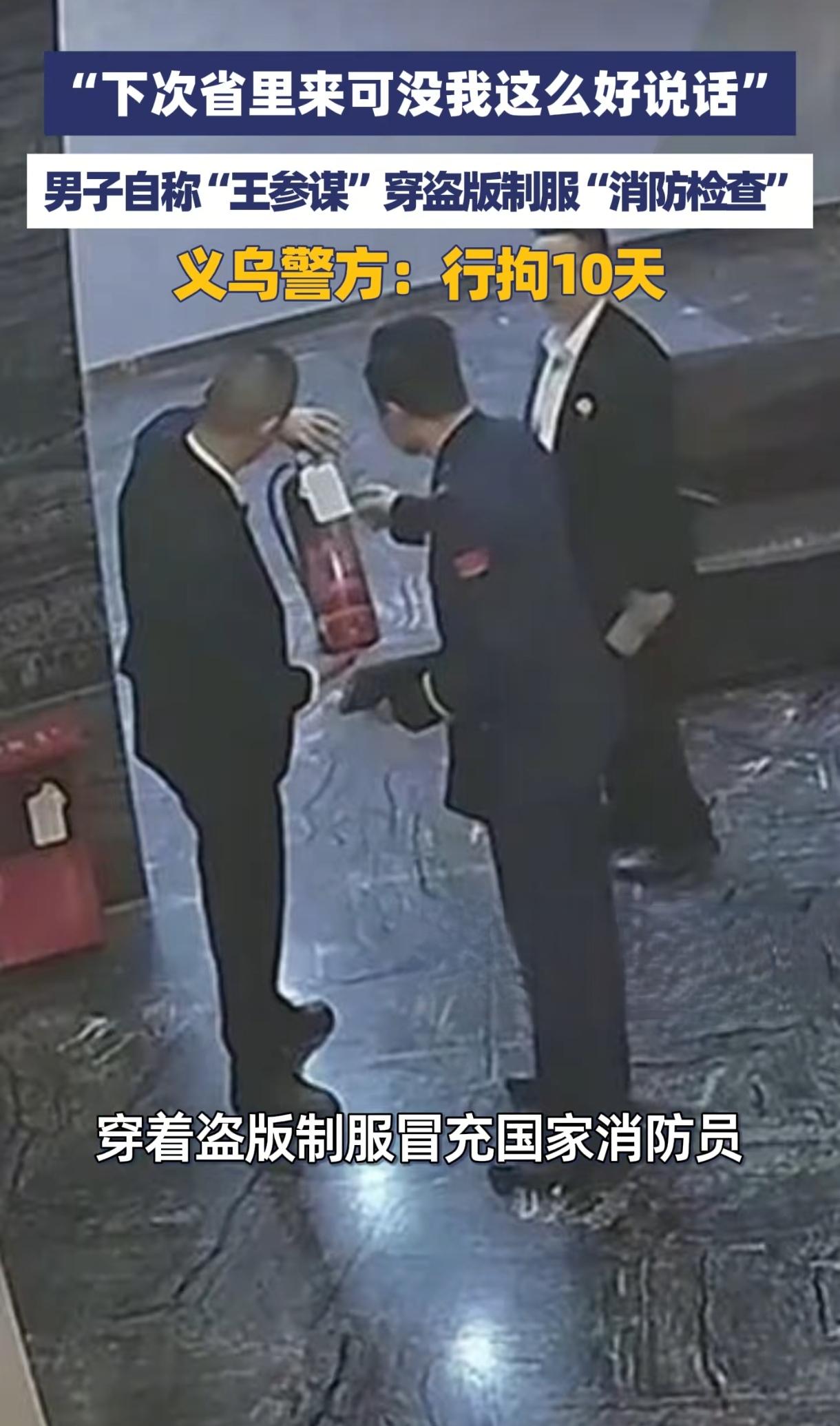浙江义乌“王参谋”落网!穿盗版制服夜查足浴店,只为过一把“官瘾”? 这年头,啥奇葩人都有。义乌这位“王参谋”,不为钱也不为色,就为了过一把当官的瘾。 他大晚上不睡觉,穿上从网上买的假消防制服,专挑娱乐厅、足浴店这些地方去。进门就摆出一副领导的架子,让人家店员带着他“检查工作”。 可这人检查得挺怪。消防通道、喷淋系统这些关键地方,他看都不看。就只盯着灭火器,再就是抽查员工,会不会背那些消防口诀。 临走前,他还撂下狠话,吓唬人家:“灭火器用这么不熟练,下次省里来检查,可没我这么好说话!” 第一次去,他制服穿得乱七八糟,像混搭。第二次去,居然换上了全套“国家队”的行头,看来回去还专门做了功课。 结果在一家足浴店露馅了。店员问他,怎么一个人来检查?他嘴硬,说还有组员在隔壁酒店。店员多了个心眼,跑去隔壁一问,根本没人!马上报警。 警察一查,更让人无语。这个姓王的,前后逛了4家店,既没骗钱,也没骗色。他干这事,纯粹就是为了“满足虚荣心”,想过一把被人前呼后拥、点头哈腰的官瘾。 最后,这位“王参谋”因为招摇撞骗,被行政拘留了10天。那套盗版制服,也被没收了。 有网友觉得,这事值得细想。为啥店员会被骗?说明店里可能确实存在消防问题。连骗子都能看出的问题,真正的职能部门平时检查到位了吗? 还有网友认为,这说明消防部门的权力太大了。现在开店,消防不点头,根本干不成。应该查查这里面有没有别的事。 说到底,虚荣心穿上“官服”,那也是纸糊的威风,一捅就破。这位“王参谋”用荒唐的表演,倒是给所有商家上了一课:真正的检查不会单枪匹马,真正的规范也用不着虚张声势。