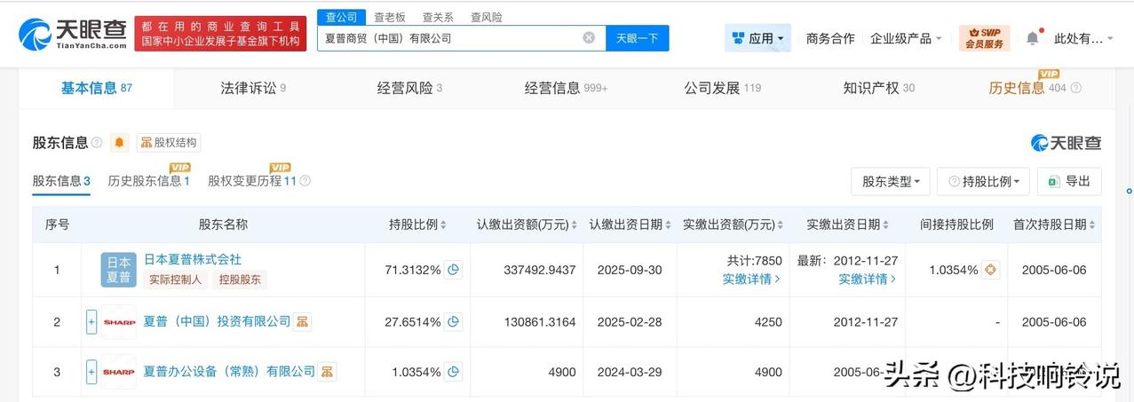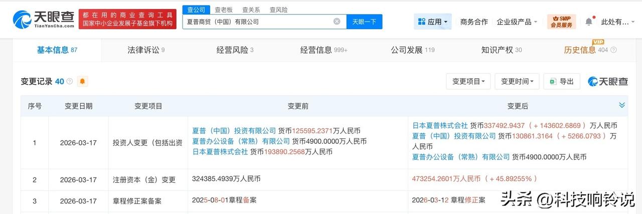 【夏普商贸中国公司增资至47.3亿 增幅约46%】 天眼查工商信息显示,近日,夏普商贸(中国)有限公司发生工商变更,注册资本由约32.4亿人民币增至约47.3亿人民币,增幅约46%。 该公司成立于2005年6月,法定代表人为北村諭(KITAMURA SATOSHI),经营范围包括家用电器销售、通讯设备销售、电气设备销售、机械设备销售、电子产品销售等。股东信息显示,该公司由日本夏普株式会社、夏普(中国)投资有限公司、夏普办公设备(常熟)有限公司共同持股。 天眼查信息: