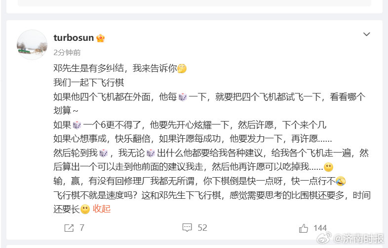 如果他四个飞机都在外面,他每?一下,就要把四个飞机都试飞一下,看看哪个划算~如果?一个6更不得了,他要先开心炫耀一下,然后许愿,下个来个几如果心想事成,快乐翻倍,如果许愿每成功,他要发力一下,再许愿……然后轮到我?,我无论?出什么他都要给我各种建议,给我各个飞机走一遍,然后算出一个可以走到他前面的建议我走,然后他再许愿可以吃掉我……输,赢,有没有回修理厂我都无所谓,你下棋倒是快一点呀,快一点行不飞行棋不就是速度吗?这和邓先生下飞行棋,感觉需要思考的比围棋还要多,时间还要长