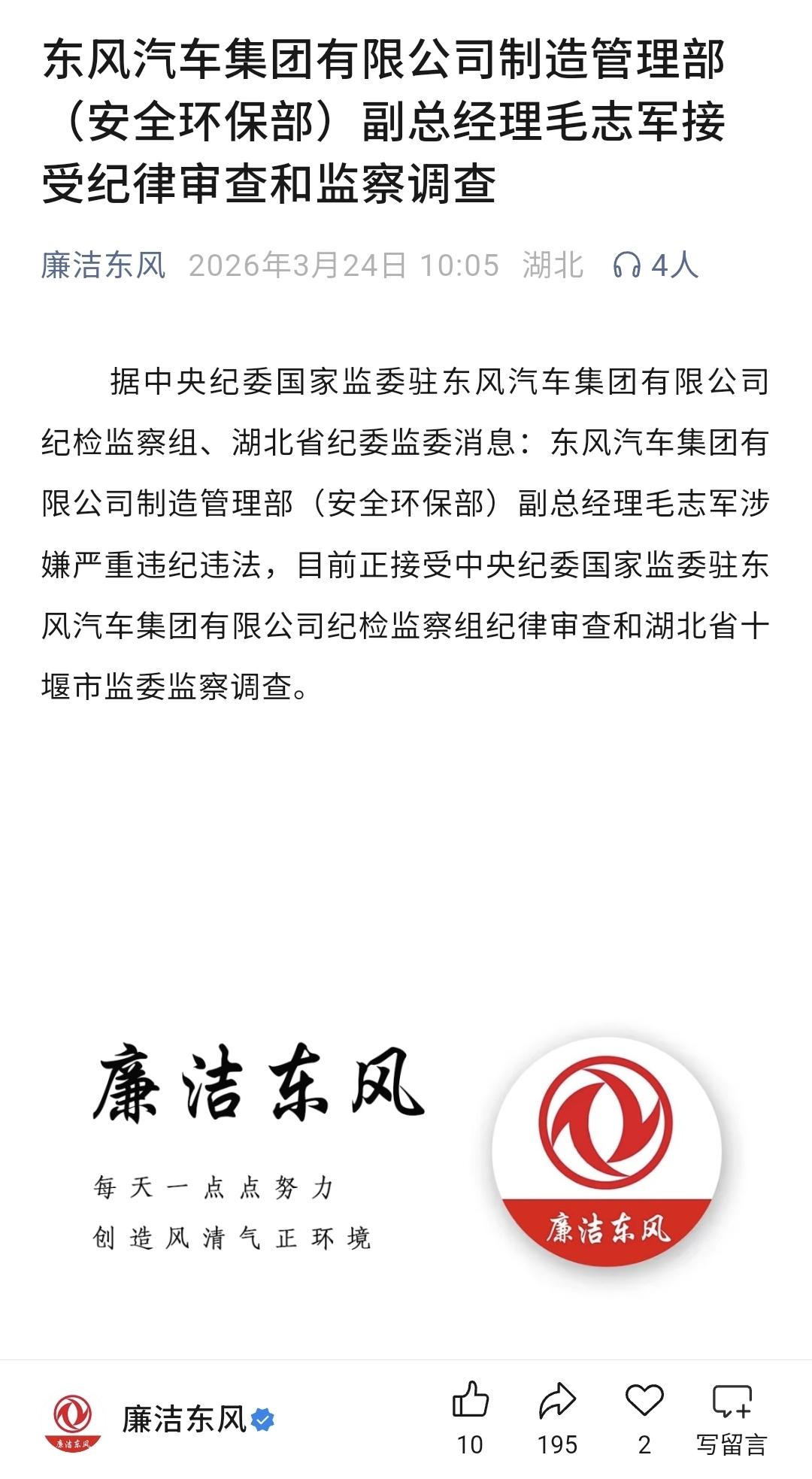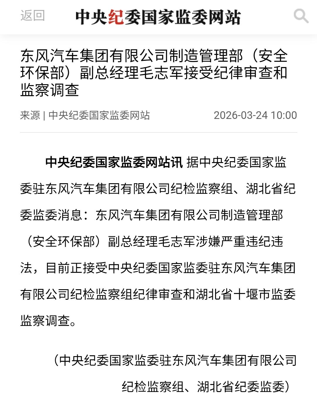 反腐不设上限,腐败没有免死金牌:东风汽车制造管理部(安全环保部)副总经理刘志军接受审查调查 据中央纪委国家监委驻东风汽车集团有限公司纪检监察组、湖北省纪委监委消息:东风汽车集团有限公司制造管理部(安全环保部)副总经理毛志军涉嫌严重违纪违法,目前正接受中央纪委国家监委驻东风汽车集团有限公司纪检监察组纪律审查和湖北省十堰市监委监察调查。 公开资料显示,毛志军,1971年8月出生,研究生学历,工商管理硕士,毕业院校不详。历任东风延锋汽车饰件系统有限公司(现已更名为东风延锋汽车座舱系统有限公司)党委书记、副总经理,总经理。2021年10月,毛志军被聘任为东风电子科技股份有限公司副总经理,成为东风汽车党委直接管理的二级副职干部,正式走上高级管理岗位。 2022年4月,毛志军被调入东风汽车总部工作,转任东风汽车集团有限公司经营管理部副总经理。2024年12月,东风汽车对总部职能部门实施改革,成立制造管理部(安全环保部),毛志军东风汽车集团有限公司制造管理部(安全环保部)副总经理,东风汽车集团股份有限公司制造管理部(安全环保部)副总经理,直至此番因涉嫌严重违纪违法而接受审查调查。 进入2026年之后,东风汽车的反腐态势相较于2025年并未呈现疲软态势,反而呈现出向全产业链纵深推进、向基层穿透的显著特征。截止目前,在短短1个多月的时间里,驻东风汽车纪检监察组就已经密集查处了5名涉嫌严重违纪违法的党员干部,且均为级别相当于正处级及以上的高级管理人员。 本年度在毛志军以前,东风汽车内部接受审查调查的高级管理人员还包括东风汽车股份有限公司铸造工厂原厂长、党总支书记张斌,原东风裕隆汽车有限公司采购总部副总部长陶骏,东风物流集团股份有限公司党委委员、执委会委员钟志勇,东风柳州汽车有限公司采购中心党总支部书记、副总经理王小东等4人。 此番毛志军接受审查调查,充分表明东风汽车反腐不设上限、不留死角,腐败领域没有所谓的“免死金牌”和“避风港” 。东风汽车持续常态化反腐动作释放了一个明确信号——反腐已进入常态化、制度化阶段,不再是阶段性的突击行动,而是提升企业治理效率、应对市场内卷的内生需求。证明了东风汽车正通过“刮骨疗毒”式清算,为品牌向新能源转型肃清内部生态障碍。