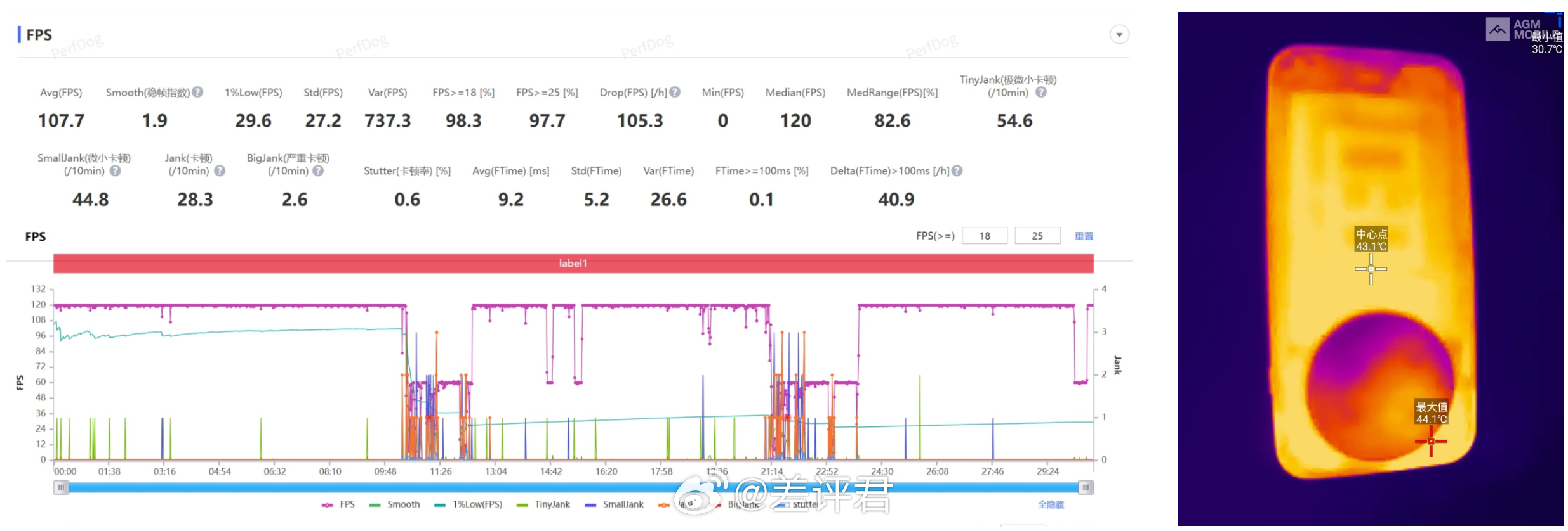 这颗麒麟8000处理器,表现怎么样呢?我们测试了下打 《王者荣耀》 的表现,半小时下来可以看到除了人物死亡复活和重新开局帧率会掉到60帧,其余时间都是顶着120帧在跑,非常稳定。测试结束后机身最高温度44.1摄氏度,而且热的很均匀,说明散热也不错。