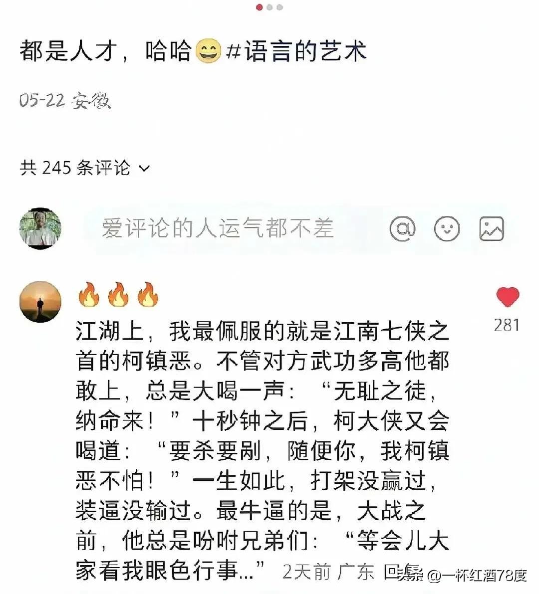 一个人若能把语言艺术运用到让人挑不出瑕疵的地步,那无疑是大神级别的存在。实际上,柯震恶便是妥妥的语言大师。 网上流传着这样一个段子,柯震恶高呼“无耻之徒,待老夫来与你决一死战”,一分钟后又道“无耻之徒,要杀要剐,悉听尊便”。当年看到这段,既觉气愤又感无助,如今却觉得既搞笑又经典。 在《射雕英雄传》里,柯震恶性格冲动暴躁、嫉恶如仇。尽管他与顶尖高手过招从未取胜,像南帝北丐、东邪西毒这些,但他的武功其实也颇为厉害。 西毒欧阳锋都曾夸赞过他,他的听风辨形之术已练至化境,能轻松躲开毒菱。 而且他一生正直无私,为了承诺,踏遍大江南北寻找郭靖并传授武艺,非要尽到师傅的责任,这种不达目的誓不罢休的精神,值得人们学习。 柯老师Z令人佩服的,还是他那打架从未赢过、嘴炮从未输过的坚韧劲头。 柯大师
