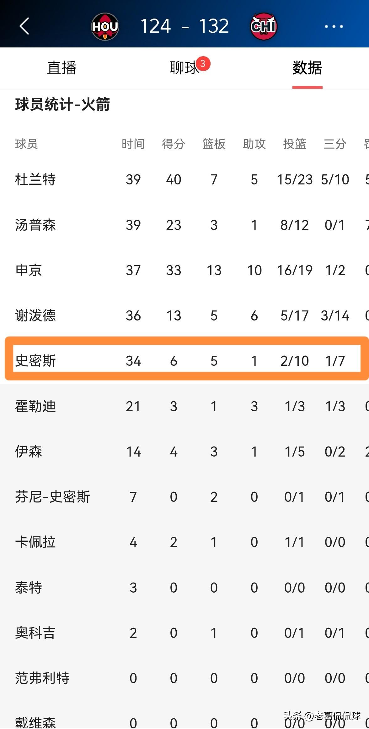 火箭大将小史密斯的进攻效率真是低的吓人!在今天火箭客场以124:132输给公牛的比赛中,小史密斯的进攻效率非常的低效,简直吓死人了。 整场比赛下来,小史密斯首发出战34分钟,投篮10中2,其中三分球7中1、罚球1中1特别低效的得到6分,还有2次失误和3次犯规。 如果说谢波德是火箭失利的第一罪人,那么小史密斯就是第二罪人。