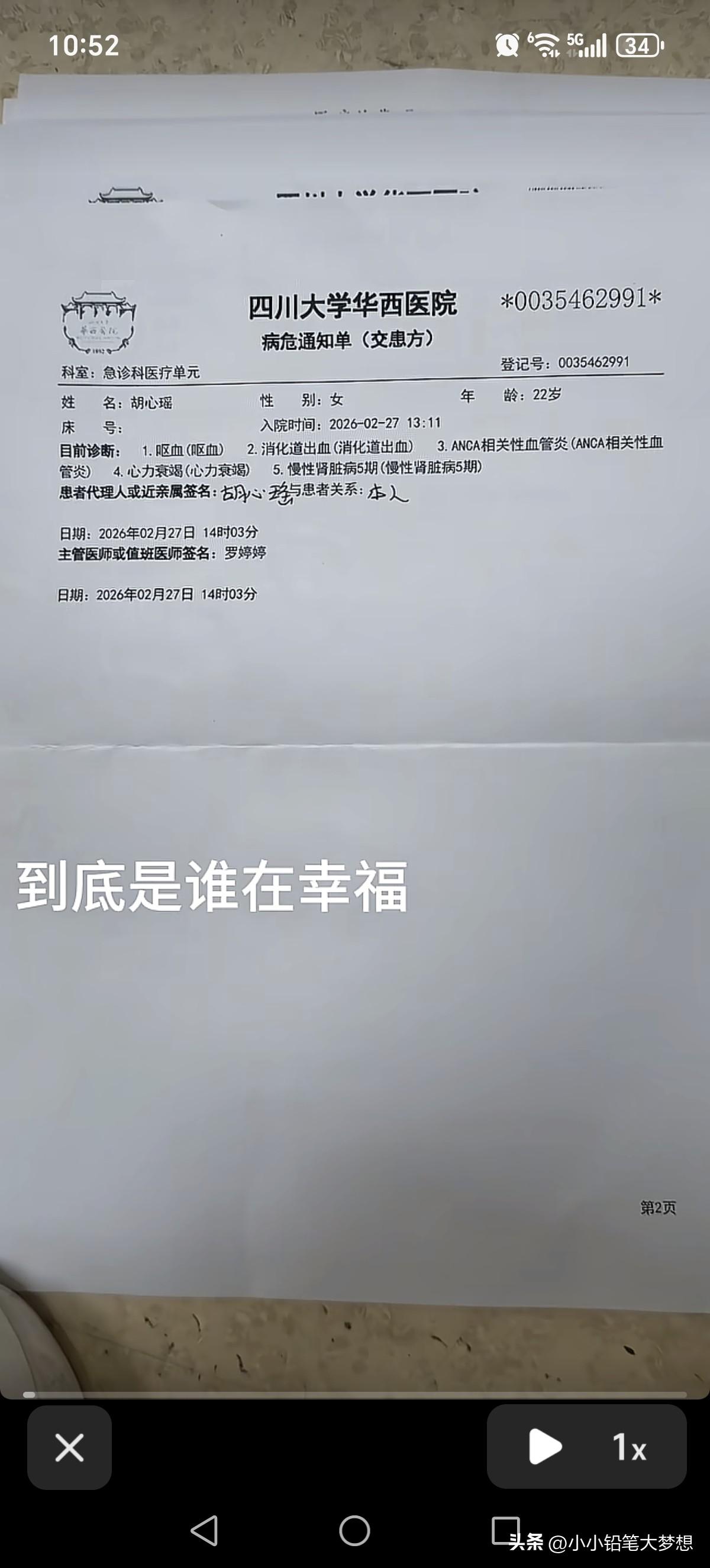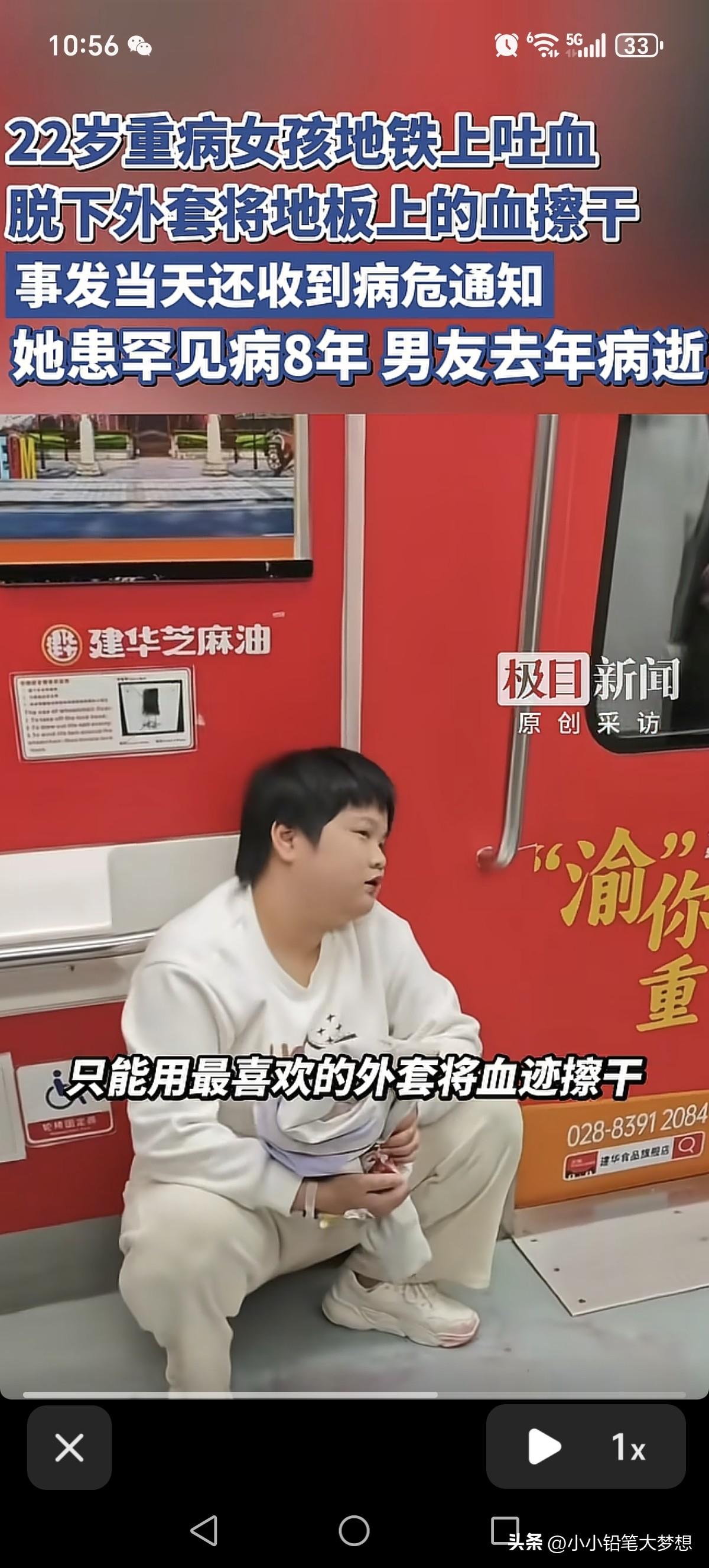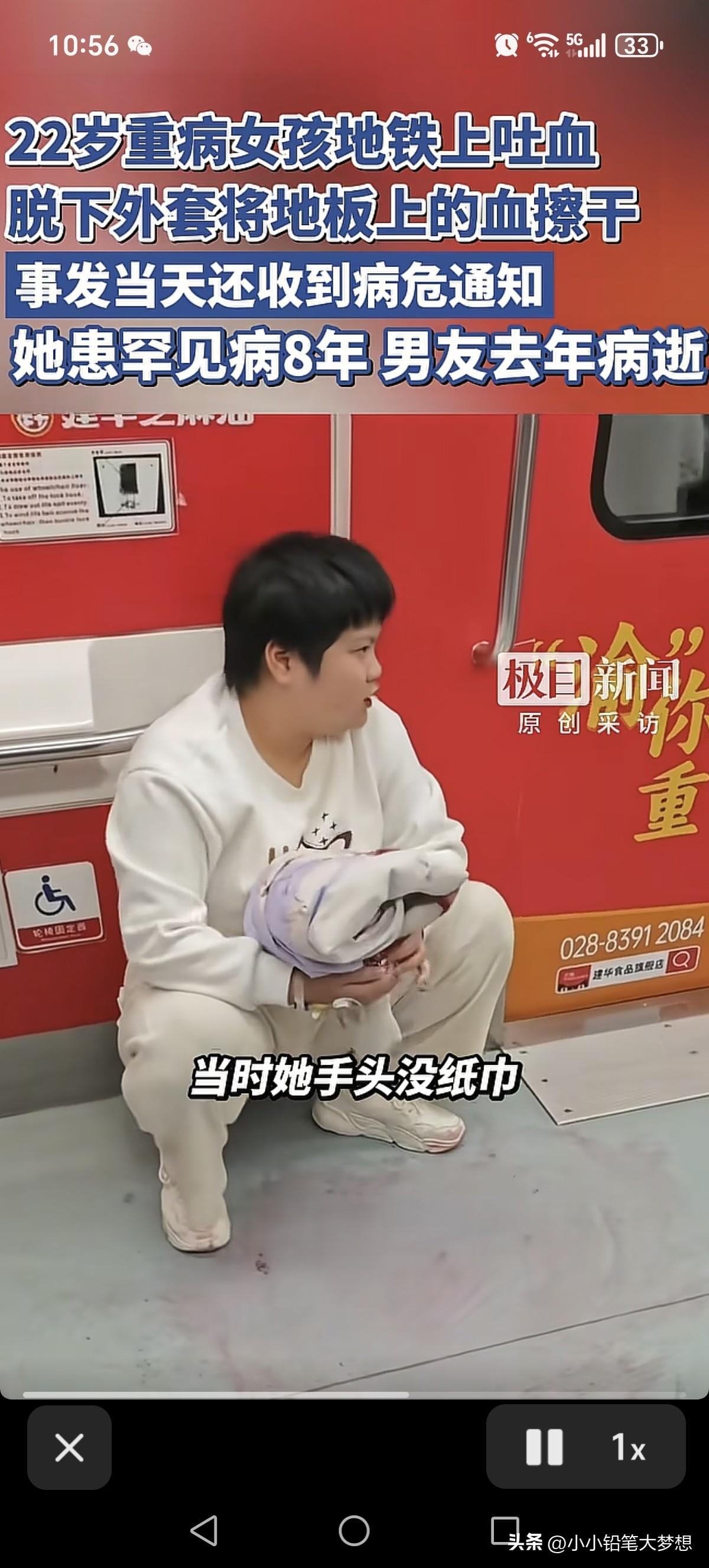 真是善良懂事的,令人心疼!22岁的女孩在地铁内吐了一滩血,即使身体很不适,但她害怕别人受到惊吓,也怕别人弄脏了鞋子,还第一时间强忍着蹲下来,脱下了自己的外套反复在地铁地板上擦拭干净。 这一幕被一个同车的乘客拍了下来,这个乘客说这事发生在3月23日重庆地铁1号线上, 她突然吐血,确实吓到了旁边的乘客,当时看她的脸色特别苍白,手上还有留置的针头,但是她第一时间强忍着身体的不适,脱下了身上的衣服,蹲了下来一点一点的把地板上的血迹擦洗干净,在擦的过程中,还几次停了下来喘息。这位乘客说,她在重庆医院附近下了车,看着她离去的身影她,心中充满了好奇和苦涩。 据悉,这位女孩是00后,今年22岁,名叫胡心瑶,2018年,也就是她14岁的那一年被诊断出得了罕见病ANCA血管炎,后续发展成为了肾衰竭,出现了多种并发症,这八年来她一直跟这个病做抗争,但是因为经济问题,她没有一直没有在医院系统治疗,平常发现问题只能急性治疗。 这个ANCA血管炎,是自身免疫疾病,抗体会把正常细胞当做病毒攻击。从而导致全身多器官衰竭。但是目前来讲,指南已经有很成熟的治疗方式了。但基本是激素+免疫制剂抑制免疫系统,必要的时候血透,血浆置换,清除anca抗体。 从2025年到现在,短短的一年就已经收到了数十张的病危通知书,当天她也收到了一张病危通知书。 而这些病危通知单都是她自己一个人收着,没有告知父母,她说父母在农村已经年迈,也不想让他们担心,而她之前也当过护士,能够很好的照顾自己。 之前她因为重病拒绝了男友的2次求婚,但没想到她男友也得了重病离去在2025年去世在,她的男友临死之前还特意托人给她留了50000块钱,叮嘱她一定要好好治病。 当天下午她原本就是想要到医院进行治疗,因她这一周她都知道自己有消化道出血的情况,一天有的时候吐两三回,这次上了地铁实在没忍住就吐了一口血出来,因为突如其来的状况,她身上又没有带纸巾,只能脱下身上自己最喜欢的一件外套来擦拭地板,后来媒体采访她说:“因为出血量有点大,感觉挺血腥的,如果不处理,别人一踩会把这个地板踩的很脏,人家的鞋子也会脏掉,也害怕别人看到了,会被吓到!” 目前她要做血浆置换+蛋白+单抗联合治疗,费用大概十多万,这些年花费的费用已经达到了180多万。 她把自己这些年得病,治病的事情写成了一本小说,已经有出版社答应帮忙出版了,她希望能够快出版,然后拿到稿费,然后进入医院进行系统治疗。 不得不说,这个女孩真的很坚强,很乐观,而且很善良,都吐血了,依然心里装着别人,不肯给别人添麻烦,这么好的人, 偏偏命好苦,希望老天能够眷顾她,让她赶快好起来。