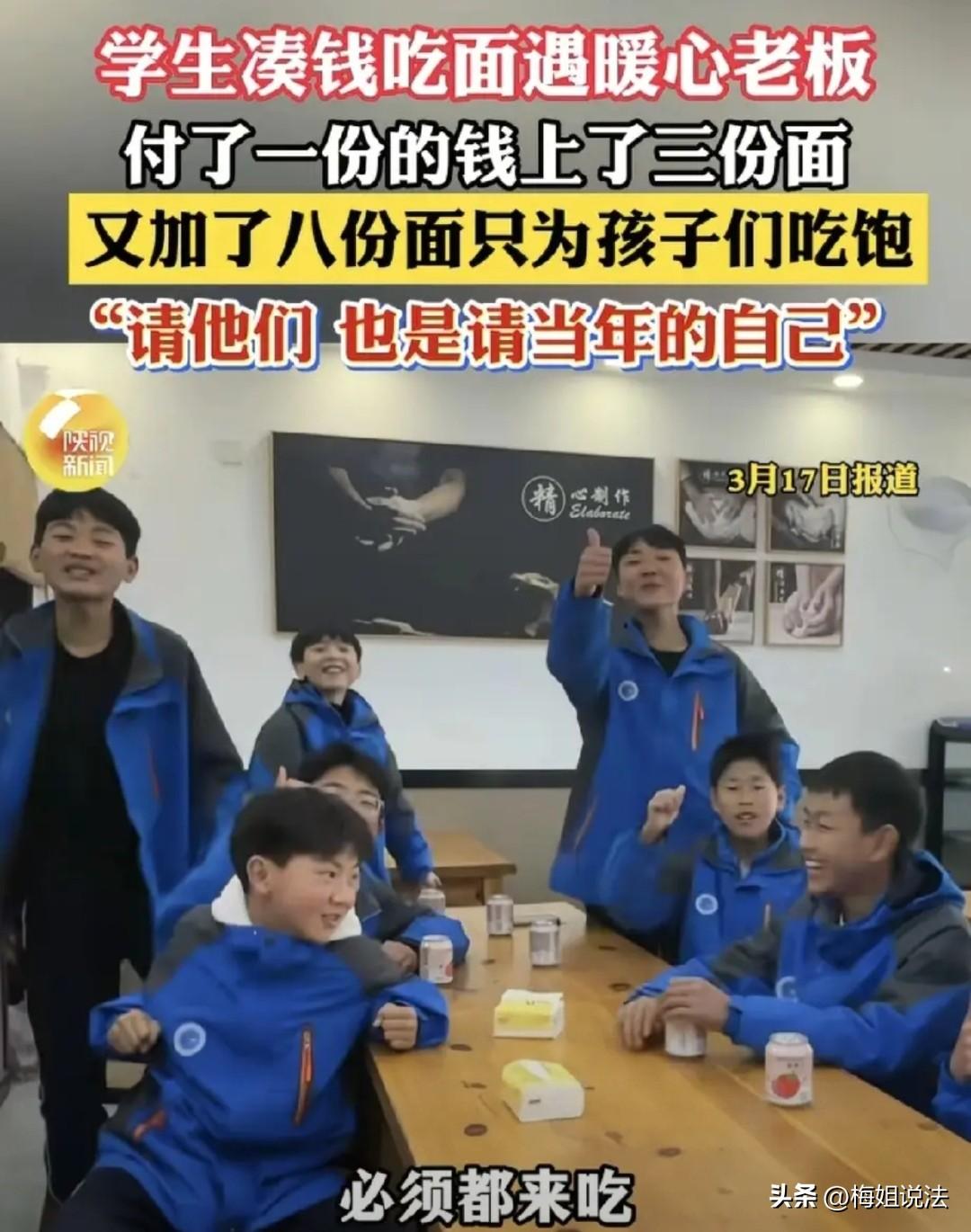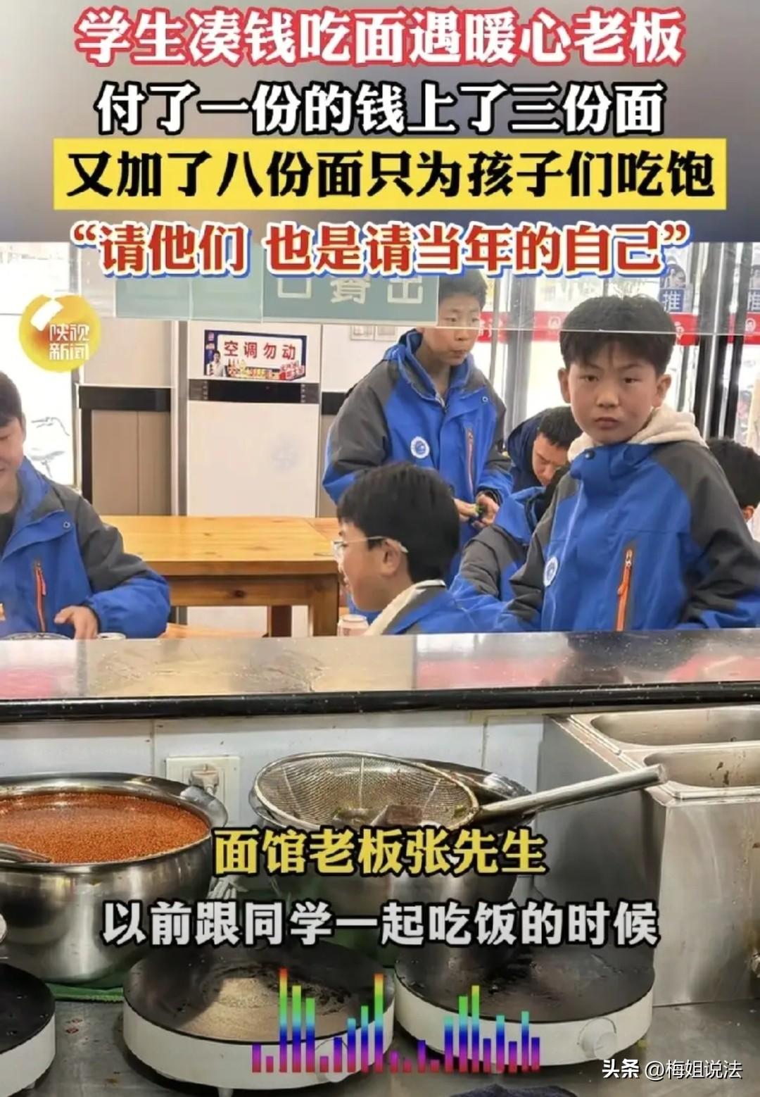 陕西西安,一面馆老板看到几名初中生凑钱吃一碗面,担心他们吃不饱,便提出让他们尽管吃,不够吃可以免费加,于是热心老板真的免费为孩子们续了8次面,还添了配菜。网友纷纷感慨:这老板的行为真的太暖心了! 近日,西安的一家面馆火了,原因就是面馆老板的做法让人太感动了。 3月13日中午,三名初中生在面馆门外徘徊许久,老板注意到他们后,对三人热心地笑了笑,然后殷切地邀请他们进店来。 三人踌躇着进店后,看了看墙上印着的菜单,有些不自在。 老板像是看出了他们的尴尬,温和地笑了笑说:“没事,你们先点,不够吃我再给你们免费添。” 有了老板这话后,三人将钱凑在一起,点了一份招牌的爆肚面。 香喷喷的面条很快端上来,三个人一顿狼吞虎咽,没两分钟就把面条捞了个精光,就连面汤都喝得一滴不剩。 但毕竟只有一碗面,三个初中孩子又正是能吃饭的年龄。这一碗面显然没让他们吃饱。 老板看着孩子们吃饭的样子,不免想起了自己的学生时代。那时候学习累,一到中午肚子就饿得咕咕叫,钱又不够,也和他们一样,几个朋友把钱凑一起,买一碗面吃。 但是,几个人合吃一碗面肯定吃不饱,等到下午上课,一个下午肚子都是饿的,这种饿着肚子上课的滋味太不好受了。 今天看到这几个孩子,老板就想起了读书时的自己。现在自己开了家面馆,遇到这样的孩子,怎么还能忍心看他们吃不饱呢? 于是,老板热心上前为他们续上了面条,没收一分钱。还扬言表示,让他们只管吃,店里的面条管够。 看着孩子们对他投来真挚感激的目光,老板也打心眼地高兴,他觉得就几碗面条而已,没什么的,这就当是在宴请年轻时的自己了。 于是,在老板憨厚热情的招待下,孩子们也没有客气,直接吃了个畅快,前前后后共续了八次面条。 老板原本以为这就是自己无意间的一次善举,却没想到孩子们走后,后面几天,又陆陆续续喊了好几名同学到店里来吃面。 无意间,也算是为小店做了宣传,给老板拉了不少客源。 现在一到中午,老板都在不停招呼客人,忙前忙后的,根本停不下来。 不过,他看到在店内吃面的学生,还是会留意两眼,当看到有吃不饱的孩子,还是慷慨地上去为他们免费续面。 当然,这些学生也是群懂事、知道知恩图报的好孩子,他们看到店里客人多,也会主动上前去帮忙收拾。 甚至,还有不少在店内吃饭的客人,看到老板的善举后,拿出手机拍了视频发布到了网上。不出意料的,这家面馆以及这个人好心善的老板火了。 许多看到视频的网友被这样的人间真情打动,根据评论区里孩子们给的面馆地址,纷纷到店里来吃面。 现在,这小店的生意也是越做越好了。而老板这种免费为初中生续面的行为,纷纷获得了网友的赞扬以及引发了不少人的热议。 有人表明这老板就是格局大,不计成本,自负盈亏,就活该这样的老板生意兴隆,挣大钱。 不过,根据《民法典》第657条,西安老板为学生免费续面、加配菜的行为属于规定的赠与合同,是老板将食品无偿给予学生、学生表示接受的民事行为,且该赠与无附加义务,属于无偿单务赠与 。 当然,老板也有权任意撤销,在面条和配菜未实际交付前可撤销赠与。后续中也可因其他原因不再履行赠予义务。 不过好在,孩子们在免费享受到了续面服务后,也没有立刻走掉,而是会主动帮忙收拾。 这也是善良的人遇上了懂得感恩的人,也算是一种爱的延续。