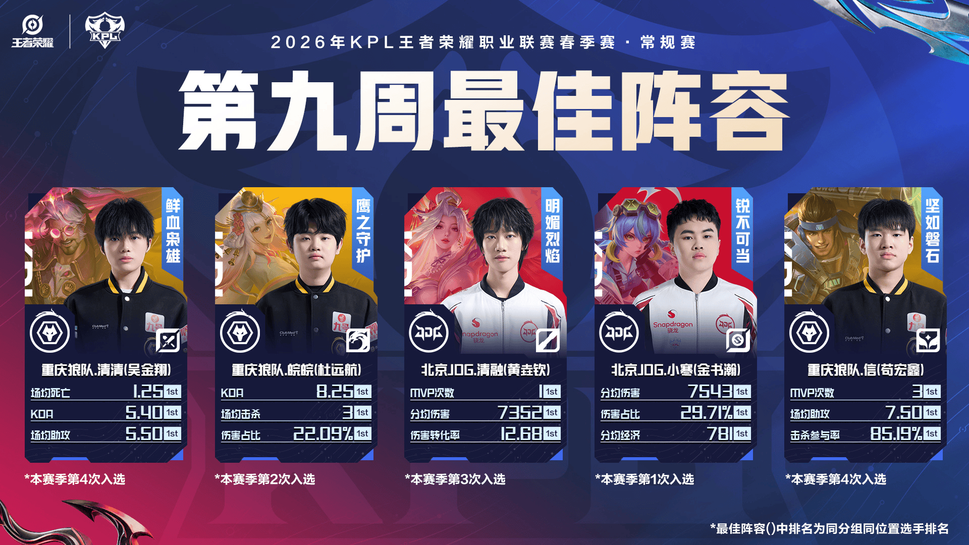 虎扑03月24日讯2026KPL春季赛第九周最佳阵容:清清/皖皖/清融/小寒/信