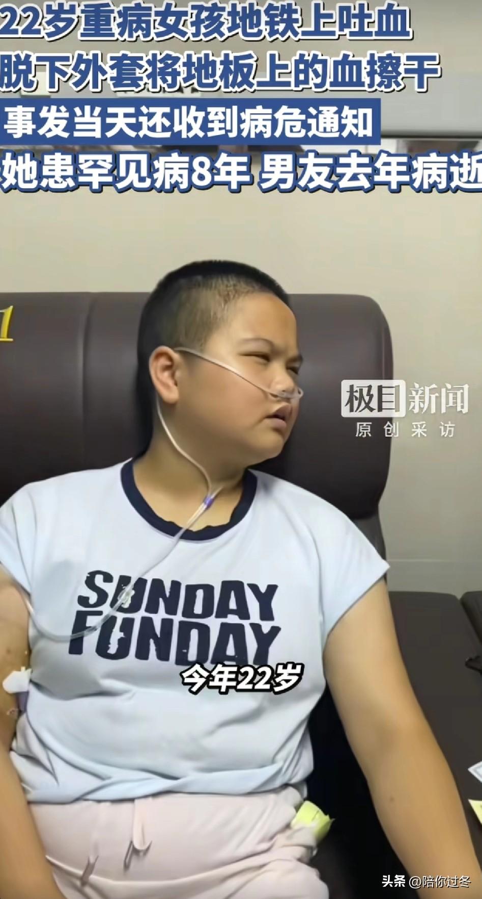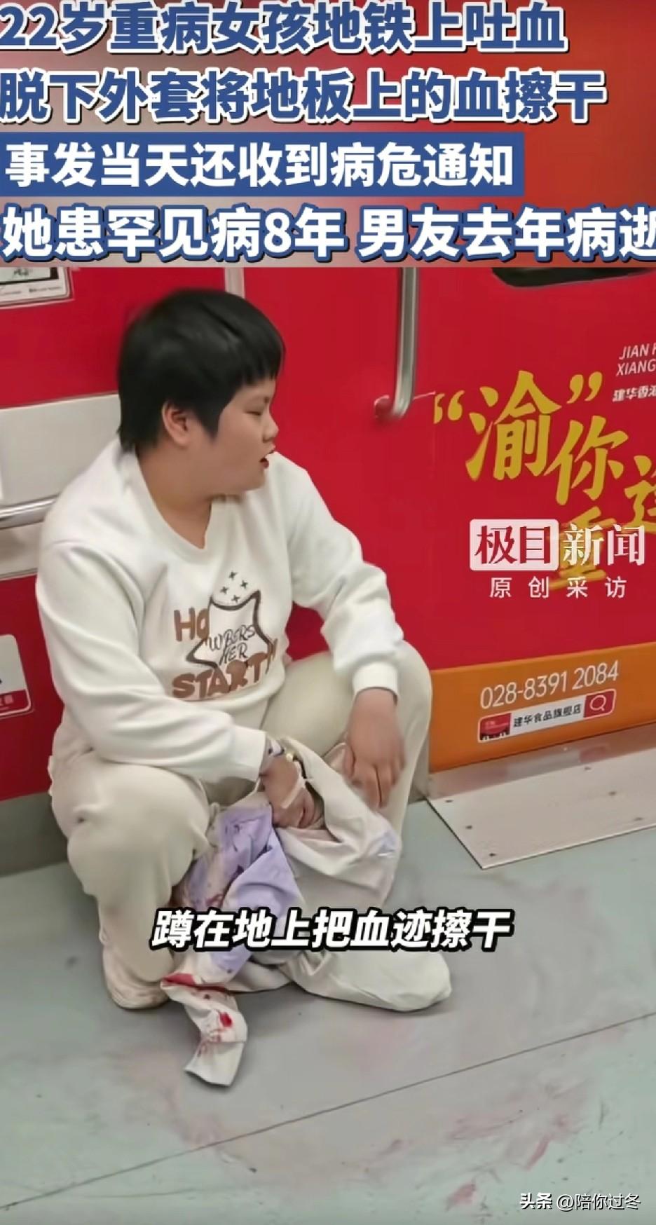 22岁女孩患重病地铁上吐血,用衣服擦净! 太让人心疼了,患肾衰竭,拒绝2次男友求婚,生活拮据,男友不幸离世,托人转5万元给女孩看病,没有人帮衬一个人依然坚强的和病魔作斗争! 3月23日,据极目新闻报道,重庆一名22岁的女孩胡心瑶,在地铁1号线上由于身患重病肾衰竭,在乘坐地铁过程中,感觉身体不适突然口吐鲜血,担心血迹被别人踩踏弄脏地板,当时身上也没有带纸巾,她只好蹲下身来用最喜欢的衣服把血迹擦干净。 由于身患重病的缘故,胡心瑶体力较弱,没擦一会就气喘吁吁,蹲靠在旁边的隔墙上,这一幕正好被同车的乘客拍下,让人看了心疼不已。 后来据记者了解到,胡心瑶从2018年就检查到身体不适,后来加重变成了肾衰竭。截至到目前,已经收到多张病危通知书。 由于家庭条件比较贫困,父母又都在老家,所以只有她一个人抗起了所有,因没钱住院治疗,所以只能在看病路上来回奔波。 此外,她因为身患重病,怕耽误男友,为此还拒绝了男友的2次求婚,可命运总是那么的不公,不久男友也患病在2年前离开了,直到男友弥留之际仍然放心不下胡心瑶,还托人转了5万元给她看病。 生活虽然艰难,可她从来没有抱怨,依然坚强的和病魔作斗争,我相信这么好的一个女孩,上天一定会眷顾她,希望她早日康复,重新展翅飞翔!加油!