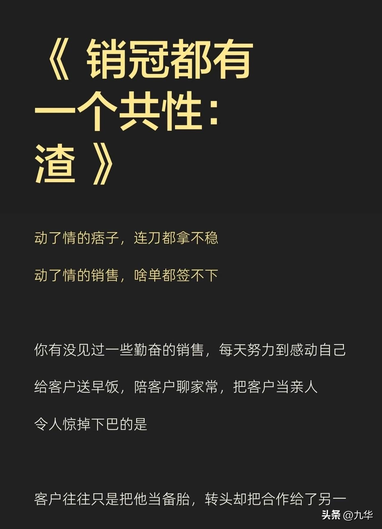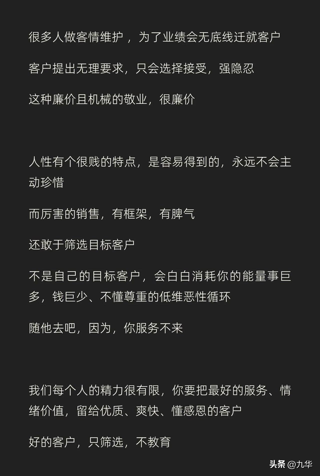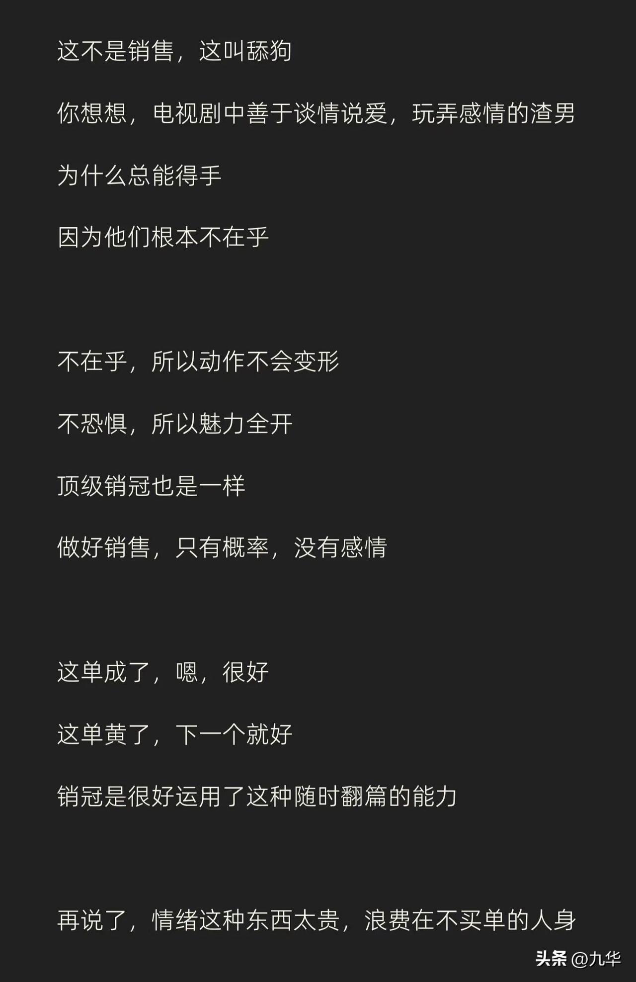 做销售不是谈恋爱,又和谈恋爱类似,不做舔狗,越渣越好,当然,渣不是人品不好,是不在乎,不内耗,客户虐我千百遍,我是真的没看见!不在乎,只想着我要得到的! 有的说这是脸皮厚,实际上还有所不同,单纯的脸皮厚是死皮赖脸,但,渣是不care,无论是销售还是恋爱,把情绪浪费在不买你单的人身上,那是极度的浪费!
