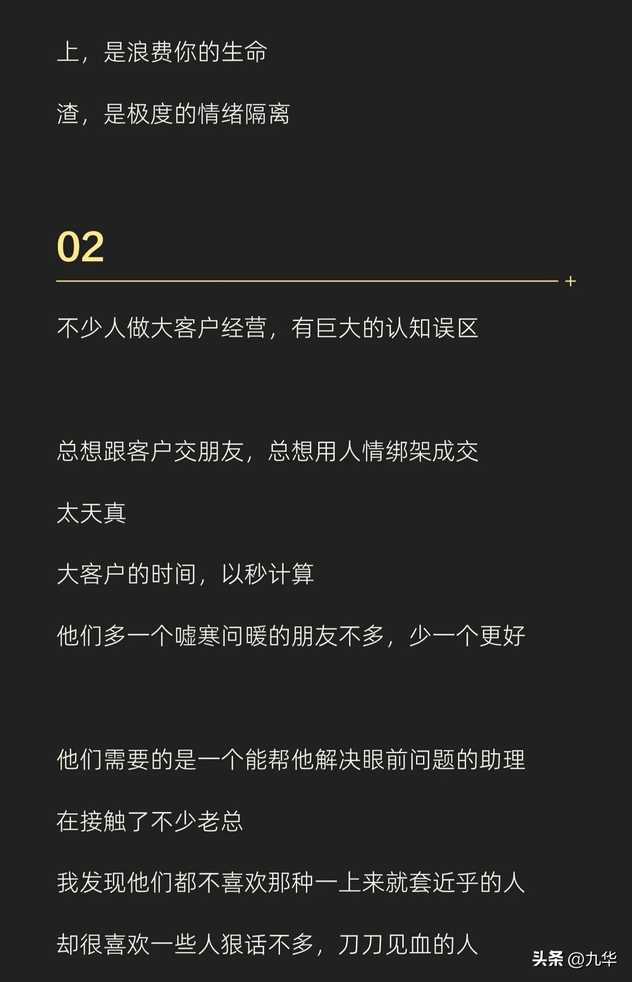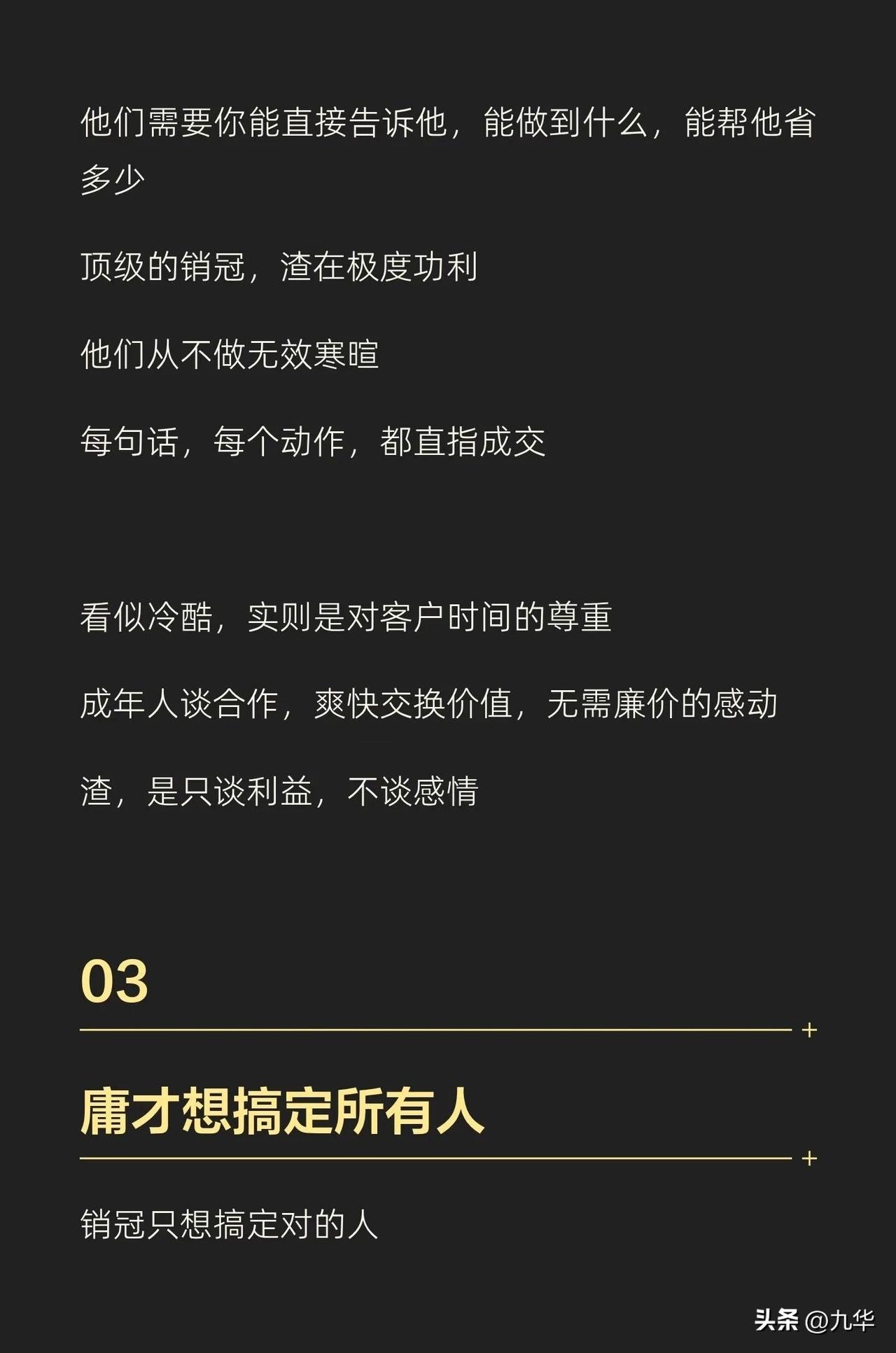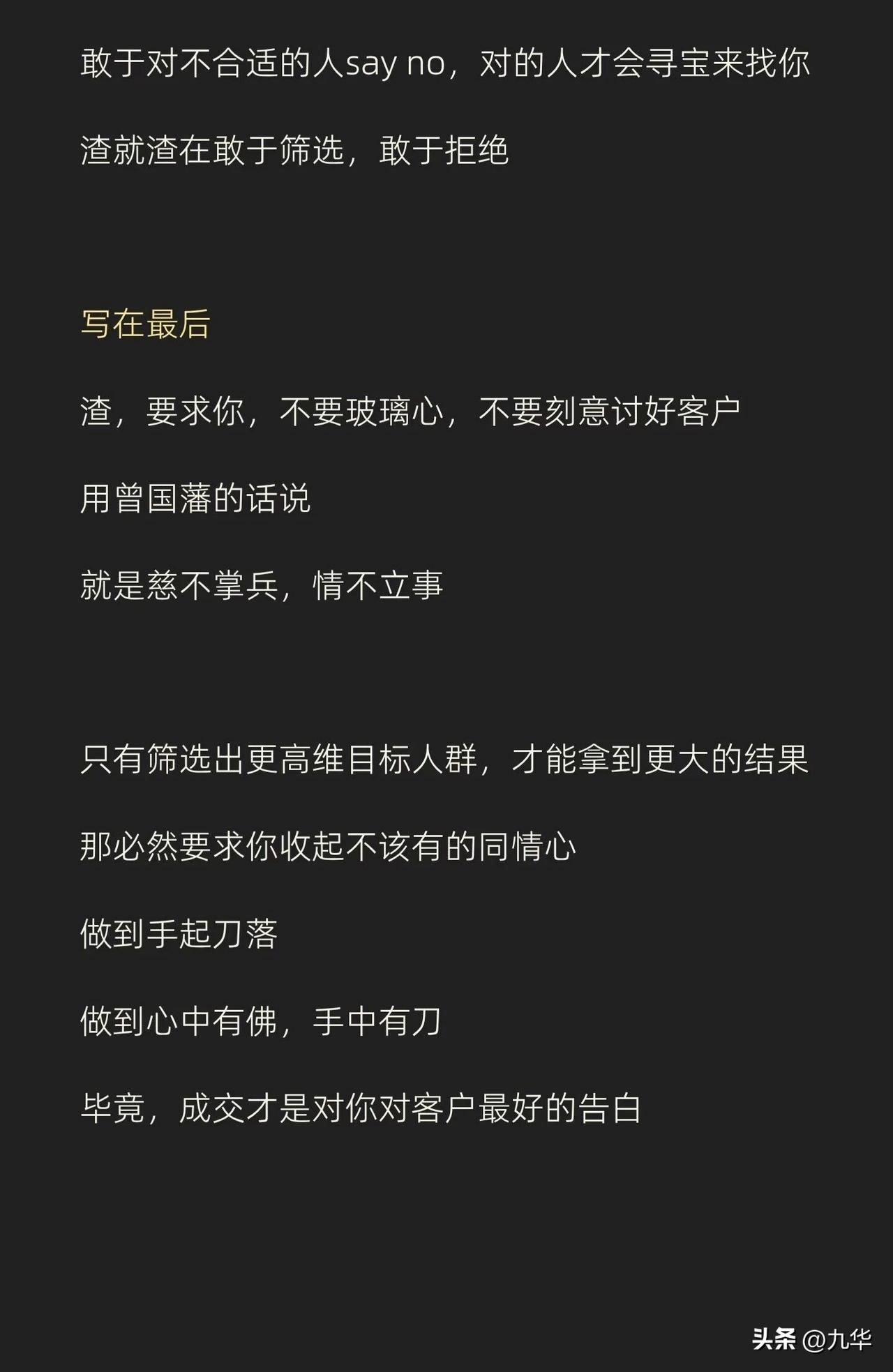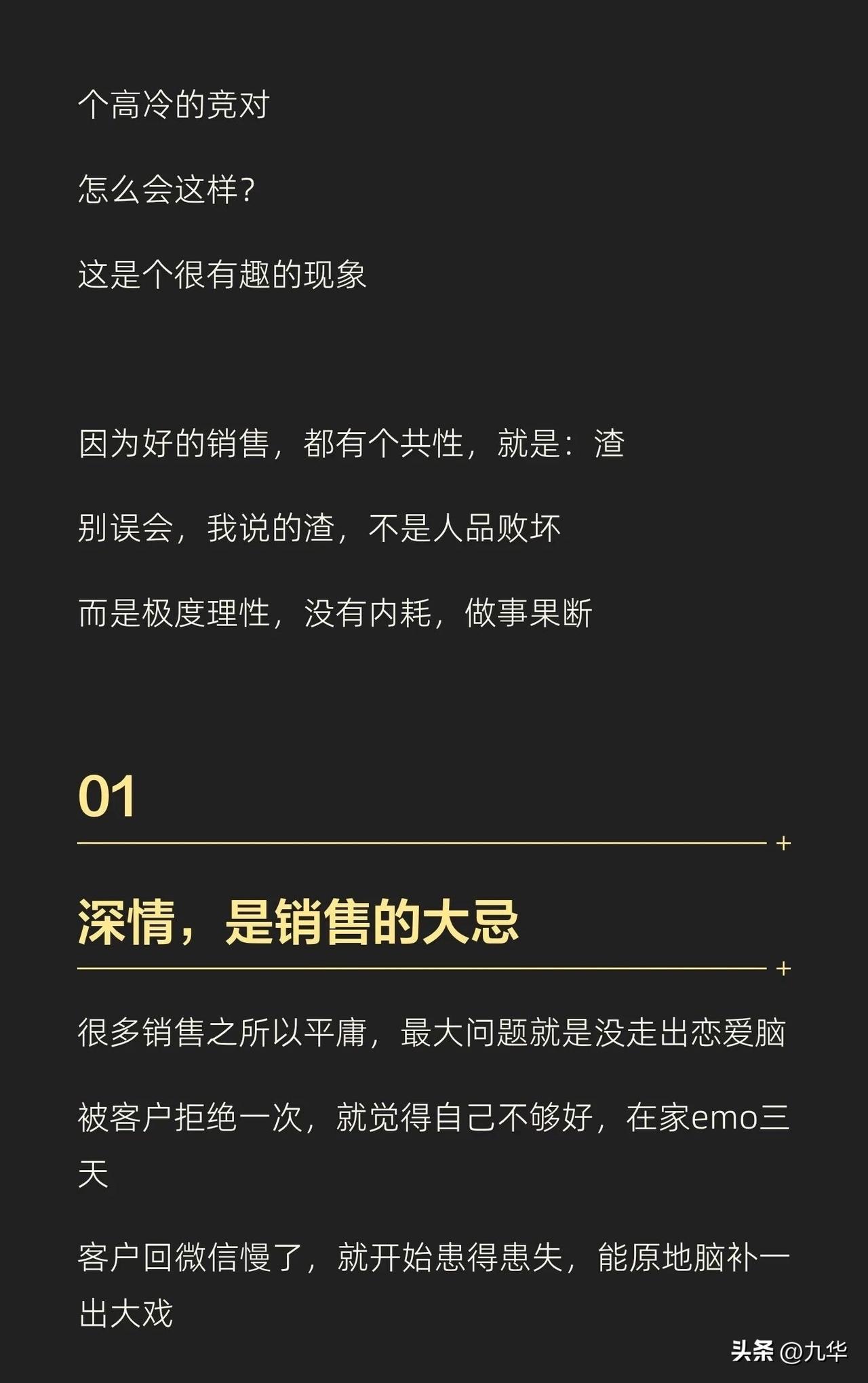 做销售不是谈恋爱,又和谈恋爱类似,不做舔狗,越渣越好,当然,渣不是人品不好,是不在乎,不内耗,客户虐我千百遍,我是真的没看见!不在乎,只想着我要得到的! 有的说这是脸皮厚,实际上还有所不同,单纯的脸皮厚是死皮赖脸,但,渣是不care,无论是销售还是恋爱,把情绪浪费在不买你单的人身上,那是极度的浪费!
