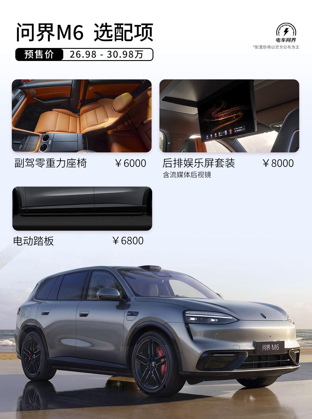26.98 万起,问界M6开启预售。华为乾崑智驾、鸿蒙座舱加上豪华配置,产品力本身没得说。 智驾全系标配华为乾崑ADS 4,激光雷达加5个4D毫米波雷达,无图城市NCA、高速NOA、代客泊车全都拉满,入门即满配,同价位独一份。 鸿蒙座舱体验感很足:16.1英寸向日葵屏、副驾灵感橱窗、26.1英寸AR-HUD、21扬声器华为SOUND,再加上零重力座椅和智能冷暖箱,舒适和豪华感都到位了。 动力有两种选择:增程版纯电续航272公里,综合续航超1400公里,亏电油耗仅4.2L;纯电版用800V平台,CLTC续航760公里,快充5分钟能补能200公里。 底盘是前双叉臂+后五连杆,高配还可以选空气悬架和CDC,操控与舒适兼顾。大五座空间、9个气囊、高强度钢笼车身,家用既安全又实用。 同级主要对手有小米YU7、理想i6、Model Y、智界R7等,全是大热门,堪称神仙打架。你最看好谁?【来自懂车帝车友圈】