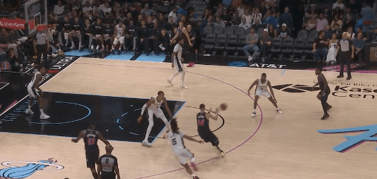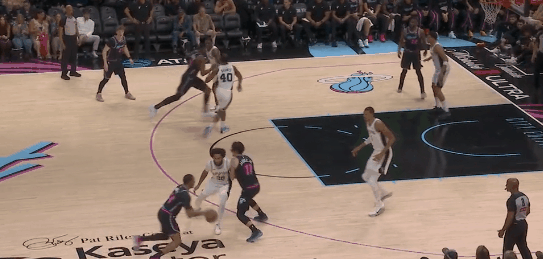希罗绕掩护钻卡斯尔,文班放空阿德巴约补位;瓦塞尔立刻轮转阿德巴约。希罗没法给阿德巴约了,只好找扣篮位的维金斯,但文班亚马飞身杀回,维金斯高抛,被文班盖掉。希罗传球不可谓不妙,维金斯抛射不可谓不巧,然而。维金斯:喂,我也是状元啊。图4。