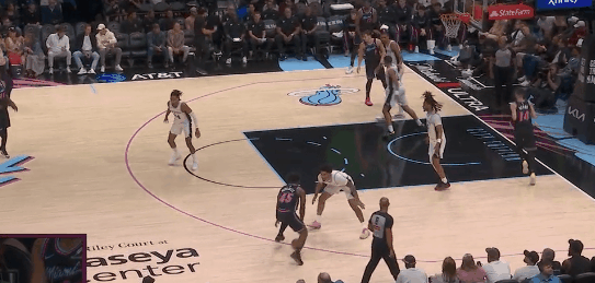 马刺今天主防挤过掩护锁三分,外加堵塞中路。小米切尔翼侧对哈珀,弱侧瓦塞尔保护中路,小米切尔只能走底线。卡斯尔指挥轮转,文班从弱侧底线横飘,盖帽。招牌的马刺堵中放边弱侧补盖,协作把小米切尔送到文班面前。图1。