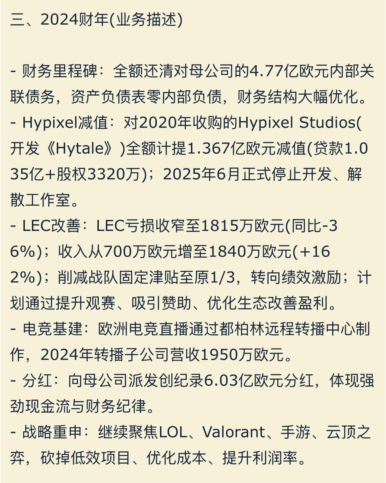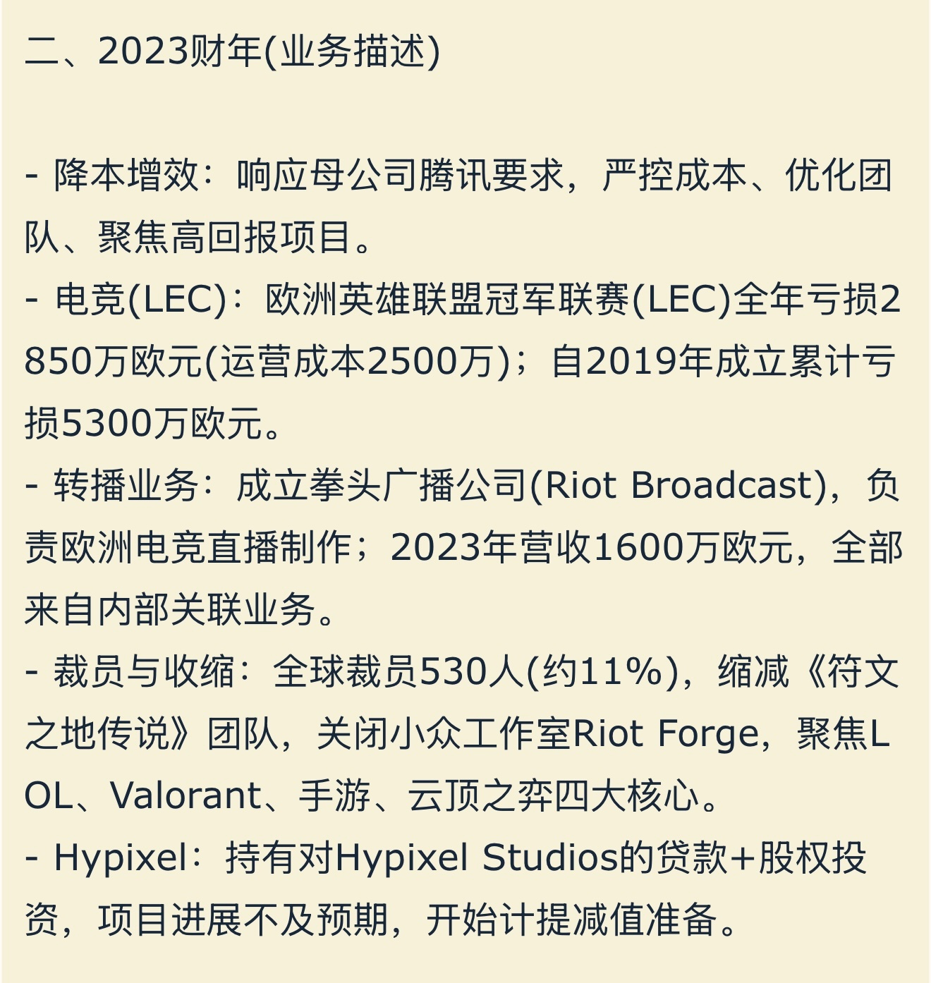 聚焦LOL、Valorant(无畏契约)、手游、云顶之弈,砍掉低效项目、优化成本、提升利润率。
