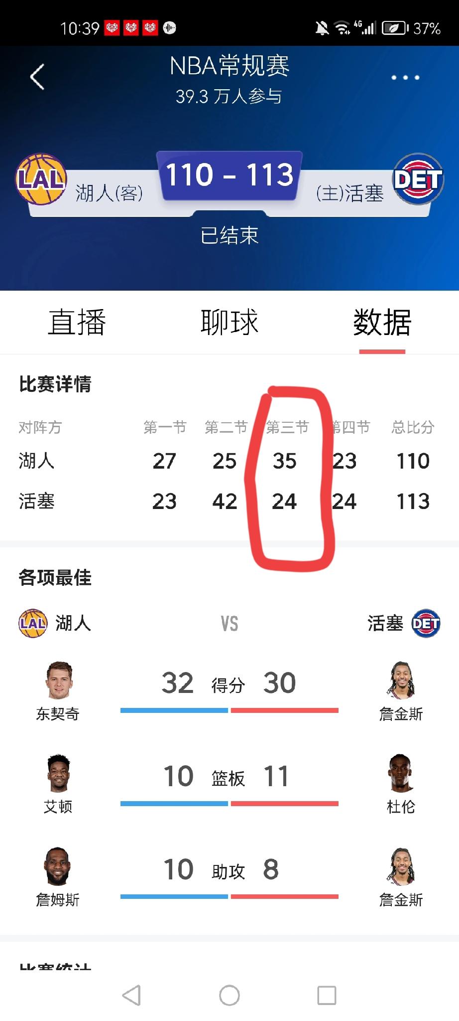 活塞横扫湖人!但湖人球迷可以笑了,三大喜讯出炉! 湖人以110比113惜败活塞,连续两个赛季被对手横扫,九连胜也戛然而止。但对湖人来说,这未必是一件坏事。 1. 这支湖人韧性极强,不到最后绝不放弃。 之前对阵掘金、魔术都完成过末节逆转。 本场第二节一度被对手打出42比25的攻击波,半场落后13分,但后两节不仅强势追回,还一度反超比分,比分始终紧咬,只是最后一攻没能把握住,遗憾输球。 2. 湖人终于放下了追逐连胜纪录的包袱,可以卸下压力、放平心态,专心为季后赛蓄力,不再为常规赛虚名硬拼。 3. 同期排名第四的火箭不敌公牛,跌至第六。 如果常规赛最终保持这个排名,对湖人来说是重大利好。大家普遍认为,湖人打火箭更有心得,季后赛首轮对阵火箭把握更大。 大史也表示:湖人和火箭各有短板,若在季后赛相遇,大小王对决,绝对会是一轮精彩的系列赛。