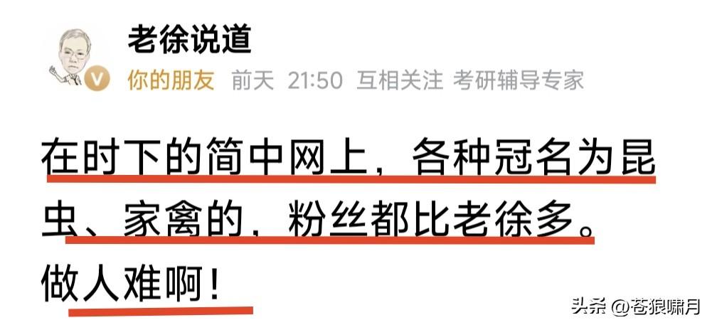 看到京城老徐感慨,苍狼更觉惭愧!在时下简中网上,那些冠名“昆虫”“家禽”的,粉丝都比老徐多。做人难呐! 苍狼想对老徐说:你好歹还有18万粉!苍狼还停留在10万上,而且涨粉十分艰难。这是怎么回事?让人不解啊! 看到一网图,上写12个醒目大字:真理往往掌握在少数“人”手里!苍狼顿时释然,也把它送给老徐,宽慰一下? 忽然想起余华一句话:为了不让真理的路上人满为患,命运让大多数人迷失了方向!以此送给所有网友共勉吧! …………