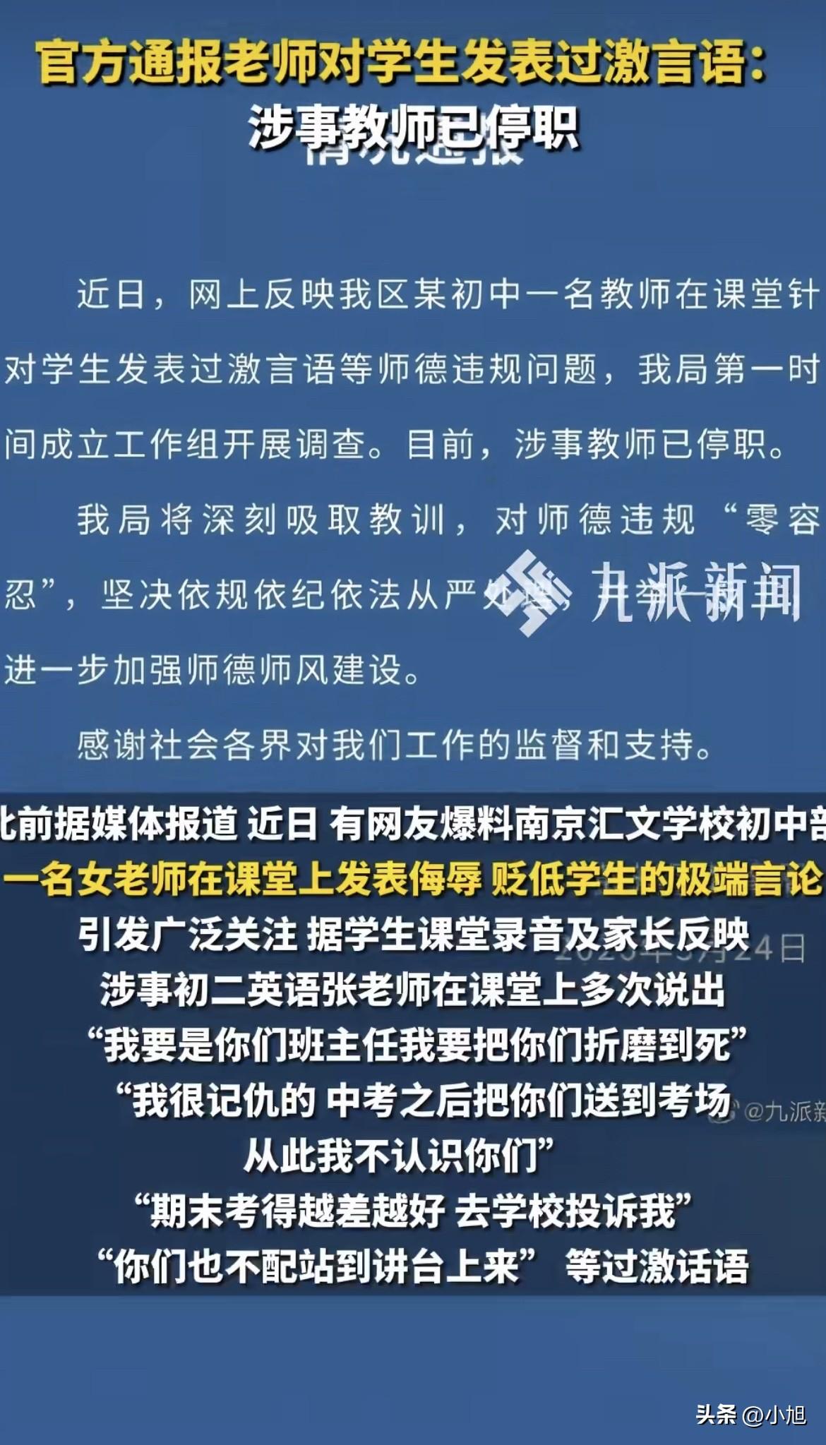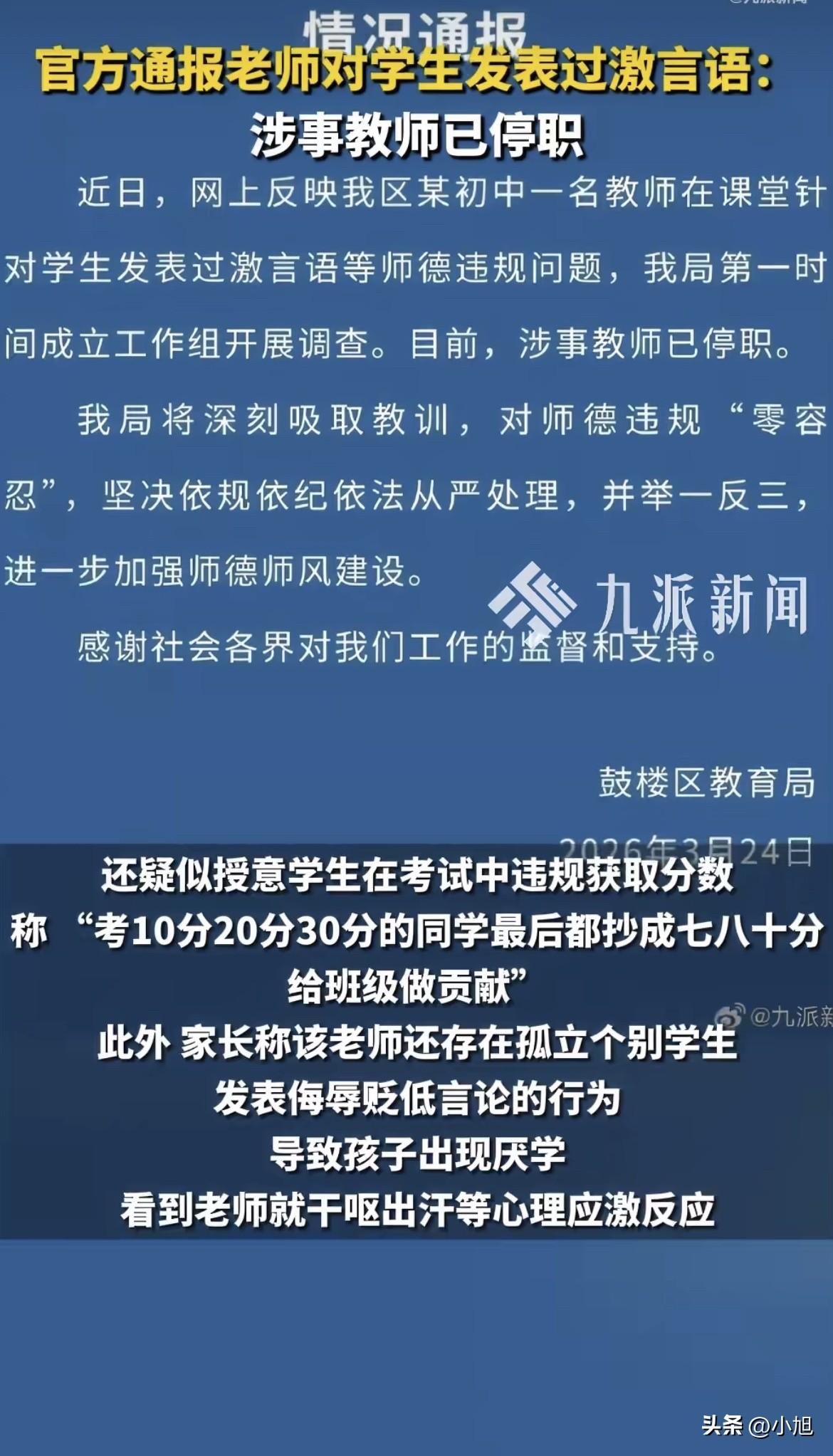 录音是家长放出来的。初二英语课,张老师的声音清清楚楚:“我要是你们班主任,我要把你们折磨到死。” 这句话说出来的时候,教室后排坐着十几个十四五岁的孩子。没人知道他们当时什么表情。但这句狠话,只是开场。 她接着又说了一句:“我很记仇的,中考之后把你们送到考场,从此我不认识你们。” “记仇”这个词,从一个老师嘴里说出来,本身就有点吓人。一个成年人,跟一群孩子说记仇,这得是多大的怨气?学生到底做了什么,能让老师记仇记到中考之后? 然后还有一句更绝的:“期末考得越差越好,去学校投诉我。” 这就有意思了。老师在课堂上主动挑衅学生去投诉自己。这是吃准了学生不敢,还是真的无所谓?不管哪种,这话从一个老师嘴里说出来,都有点不对劲。 但真正让家长炸锅的,不是骂人。 录音里,张老师清清楚楚地说:“考10分20分30分的同学,最后都抄成七八十分,给班级做贡献。” 注意这句话的逻辑——她不是让低分学生好好学习、把分数提上来,而是直接告诉他们:抄,抄到七八十分,给班级平均分做贡献。 班级平均分高了,老师脸上有光。但代价是什么?是那些认真考试、凭自己本事考七八十分的学生,被拉到了跟作弊者一样的水平线上。是那些被要求“抄”的学生,被公开贴上“低分”的标签,还被要求“做贡献”。 一个教英语的老师,教学生作弊。这事比骂人严重多了。骂人是情绪失控,教学生作弊是价值观出了问题。 有家长反映,孩子被这位张老师孤立了。具体怎么孤立的,没细说,但孩子的反应很具体——厌学,看见这个老师就干呕、出汗。 干呕、出汗,这是典型的心理应激反应。一个初二的孩子,身体已经给出了最诚实的反应:看见这个人,身体就难受。 学校那边回应得挺快。工作人员说,录音听过了,老师言论确实不合适,会找她谈话,请家长到学校面谈,还承诺不会给孩子“穿小鞋”。 但“穿小鞋”这三个字从学校嘴里说出来,本身就让人多想。这说明他们心里清楚,这种事以前发生过,或者这种事是有可能发生的。 3月24日,南京鼓楼区教育局发通报了:涉事教师已停职。通报里用了“零容忍”三个字。 停职是最快的处理方式。但这事,远没完。 咱们得想想,一个老师,为什么会在课堂上说出这些话? 有人说是老师个人素质问题。但我觉得,这事没那么简单。 现在的初中老师,尤其是主科老师,压力是真的大。班级平均分、优秀率、及格率,每个学期都要排。排得靠后,学校开会点名,绩效工资打折,评优评先没戏。有些学校甚至把成绩排名和聘任直接挂钩。 这就逼出了一种畸形逻辑:老师不是为了教好学生,而是为了把班级平均分搞上去。搞上去的手段有很多,正常的是好好备课、认真辅导,但歪门邪道也有——比如让学生在考试里抄。 张老师说“考10分20分30分的同学最后都抄成七八十分”,她不是随口说的。她是真的在乎那个平均分。因为平均分关乎她的考核、她的面子、她的饭碗。 当一个老师的压力大到这个程度,她的情绪就容易失控。于是就有了“折磨到死”、“记仇”、“你们不配”这些话。这些话不是针对某个学生,是老师情绪崩溃之后的发泄。她把对评价体系的不满,转嫁到了学生身上。 但问题在于,学生成了出气筒。 那个看见老师就干呕的孩子,他的海马体可能已经受到了损伤。研究发现,长期处于高压应激状态的学生,海马体体积会比正常学生小,记忆力也会更差。也就是说,这个老师越骂,学生越记不住单词,越记不住单词,老师越骂。恶性循环。 所以这事,表面看是一个老师的师德问题。往里看,是整个评价体系在逼人。 学校用平均分排名考核老师,老师用分数和排名管学生。学生考不好,老师被批评,老师压力大,就把压力转给学生。最后倒霉的是谁?是那些最需要帮助的低分学生。他们不但没得到帮助,还被要求“抄”,被骂“不配站在讲台上”。 教书的,最后成了反面教材。 这不是说张老师不该被处理。该处理,而且必须处理。但处理完一个老师,如果评价体系不改,下一个张老师还会冒出来。 教育局通报里说“举一反三”。怎么举一反三?是换个老师继续排名,还是重新想想,初中教育到底要的是什么? 是分数,还是人。 你觉得,除了处理这个老师,还应该做什么? 来源:综合鼓楼教育在线、九派新闻、大风新闻、新民晚报等