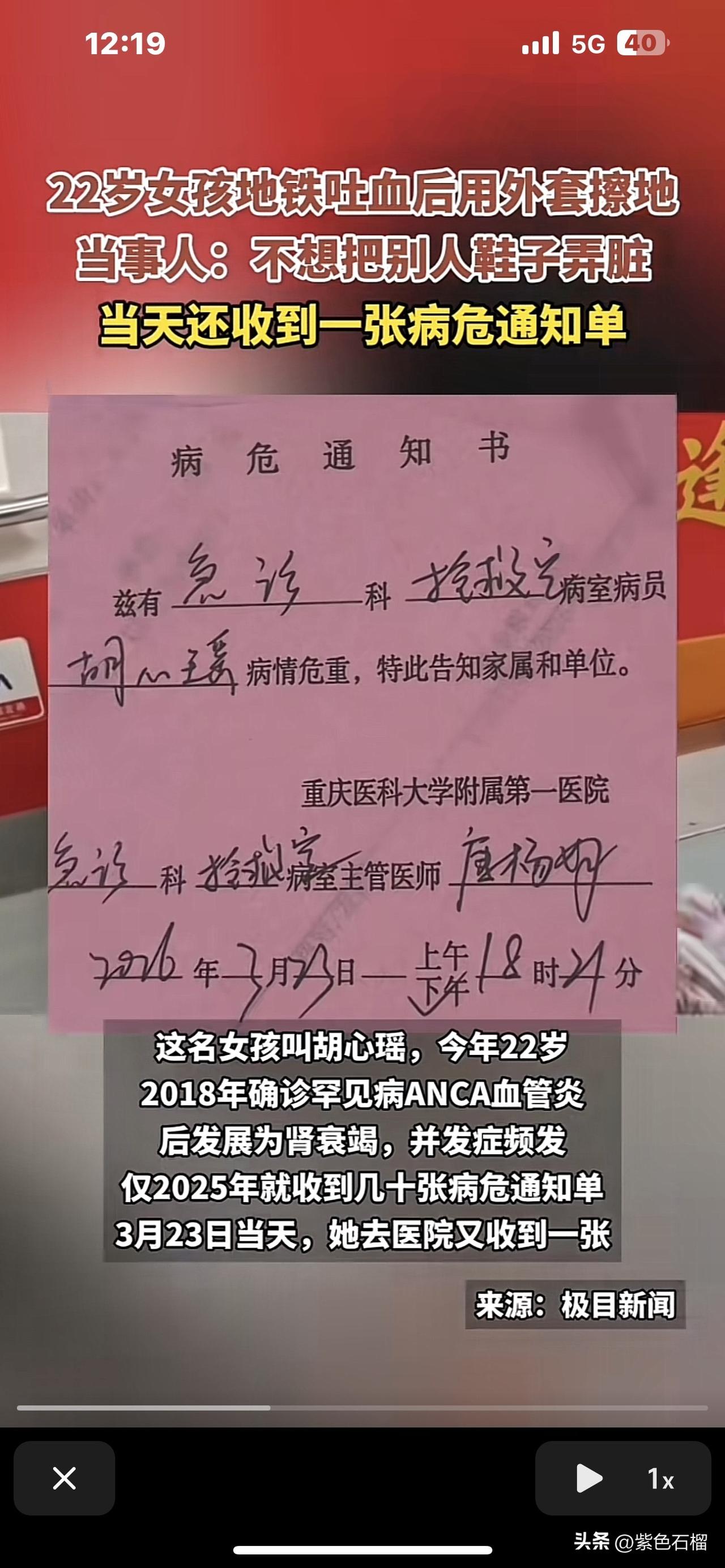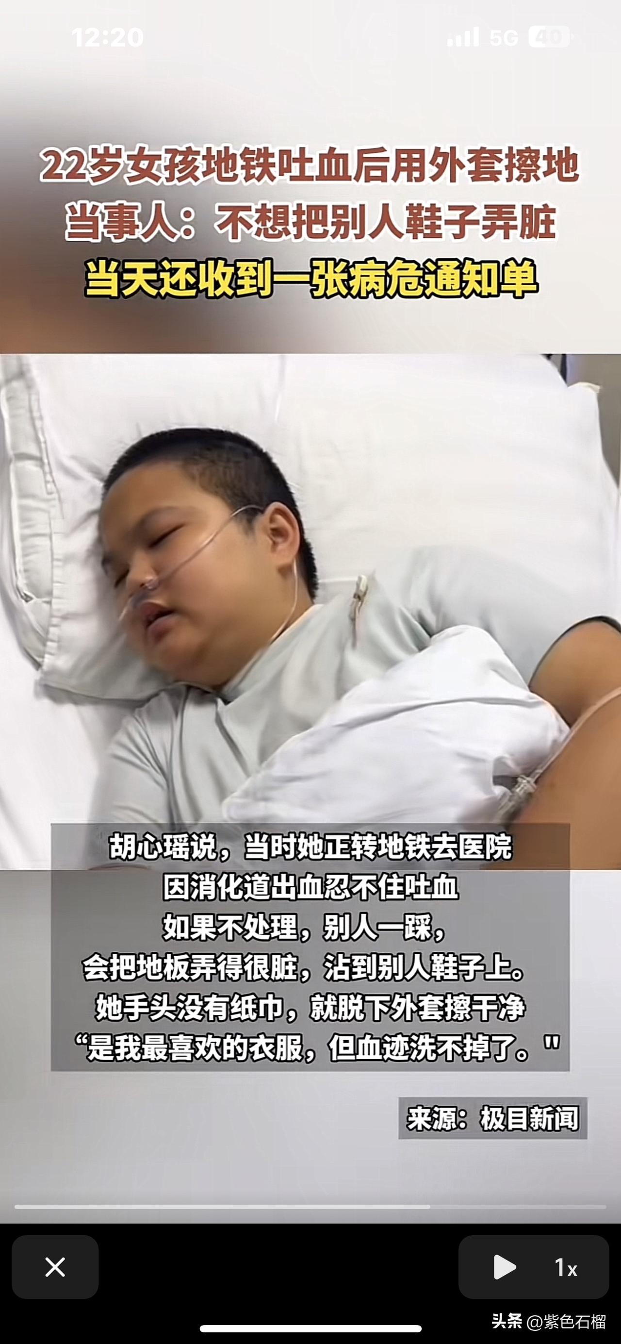 看哭了!22岁患重病的女孩在地铁上吐血,她竟脱下自己最心爱的外套,将血迹擦拭干净。 女孩名叫胡心瑶,2018年被确诊患上罕见病,病情发展为肾衰竭。八年来,她一直往返于去医院的路途。 3月23日,女孩坐地铁去医院时,因消化道出血忍不住吐血。 女孩心想,若不处理,自己吐出的血会弄脏地板,还会污染别人的鞋子。于是,她毫不犹豫地脱下外套擦拭血迹,哪怕这件外套是她的心头好,哪怕它再也洗不干净! 胡心瑶曾有个深爱她的男朋友,因自己患病,女孩多次拒绝男孩的求婚。然而去年,男孩因病离世,临终前托朋友给女孩送来5万元用于治病。 由于经济拮据,女孩无法住院接受系统治疗,仅今年就收到十几张病危通知单! 对此,有网友感慨:“听到她男朋友生病去世,心一下子揪起来了,临终前还托人给她带五万块钱……这就是善良的人遇到善良的人啊……可这是什么结局啊,谁写的剧情啊”。 愿这个善良的女孩能得到更多社会关爱,好人终有好报! (素材来源:极目新闻、杭州日报等媒体报道)