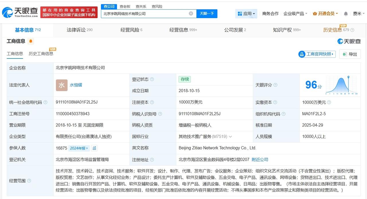 字节跳动申请注册Seedance商标 天眼查知识产权信息显示,近日,北京字跳网络技术有限公司申请注册多枚“SEEDANCE”商标,国际分类包括方便食品、医疗园艺、化学原料等,当前商标状态均为等待实质审查。 北京字跳网络技术有限公司成立于2018年10月,法定代表人为水恒熠,注册资本1亿美元,经营范围包括软件开发、会议服务、企业策划等,由抖音集团(香港)有限公司全资持股。 公开资料显示,Seedance 2.0是字节跳动推出的AI视频生成模型,可根据文本或图像创建电影级视频。今年2月,其开始小范围内测并在即梦平台上线。 天眼查信息: