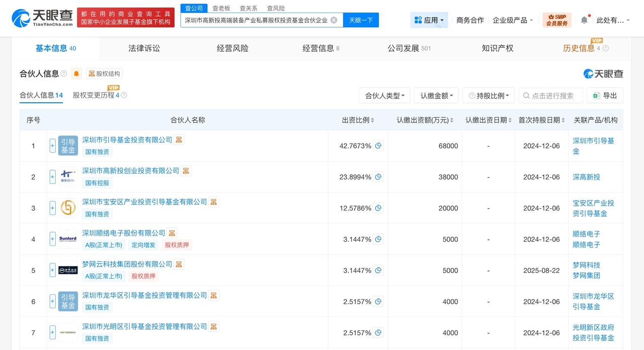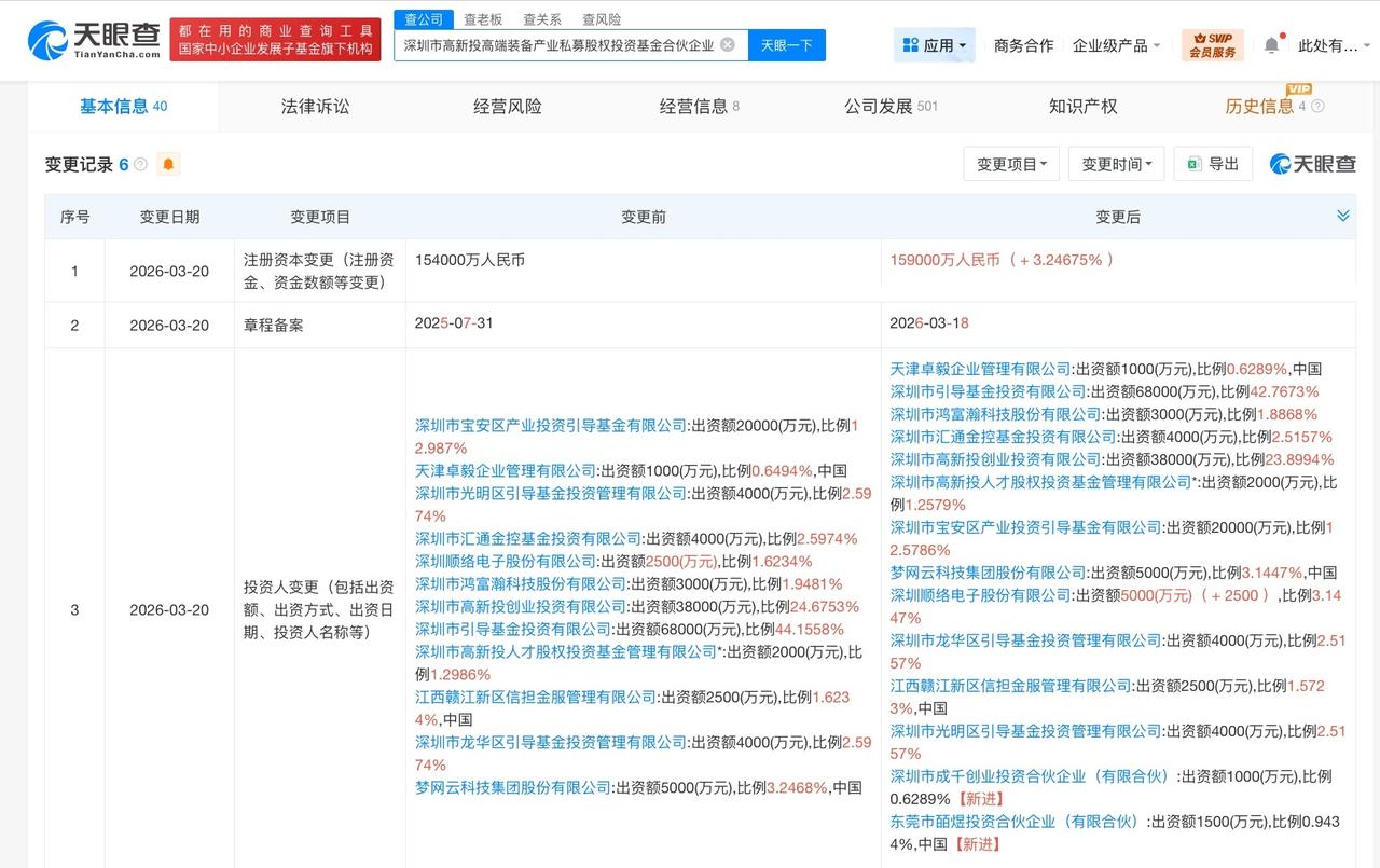 深高新投高端装备产业私募基金增资至15.9亿 天眼查工商信息显示,近日,深圳市高新投高端装备产业私募股权投资基金合伙企业(有限合伙)发生工商变更,出资额由15.4亿人民币增至15.9亿人民币,新增深圳市成千创业投资合伙企业(有限合伙)、东莞市皕煜投资合伙企业(有限合伙)为合伙人。 深圳市高新投高端装备产业私募股权投资基金合伙企业(有限合伙)成立于2024年12月,执行事务合伙人为深圳市高新投人才股权投资基金管理有限公司,经营范围为以私募基金从事股权投资、投资管理、资产管理等活动。合伙人信息显示,该基金现由深圳市引导基金投资有限公司、深圳市高新投创业投资有限公司、顺络电子(002138)及上述新增合伙人等共同出资。 天眼查信息: