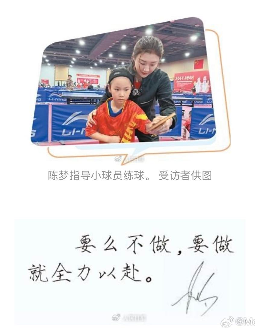 人民日报专访陈梦! 记者首先问了球迷们最关心的问题:以后陈梦还会继续参加乒乓球比赛吗? 陈梦说会的,只要有合适的比赛就会参加,她的心始终在赛场上,平时会去指导小队员们训练。 陈梦还说以后的她会一直与乒乓球运动紧密相连,自己一方面恢复训练、准备比赛,另一方面帮助小队员们成长。 看完这段采访,感觉陈梦还会参加下一届全运会,她的回答听了让人心里暖暖的,她对乒乓球的热爱和专注从未改变,无论是作为选手还是在指导小队员,那份全力以赴的劲头一直都在。